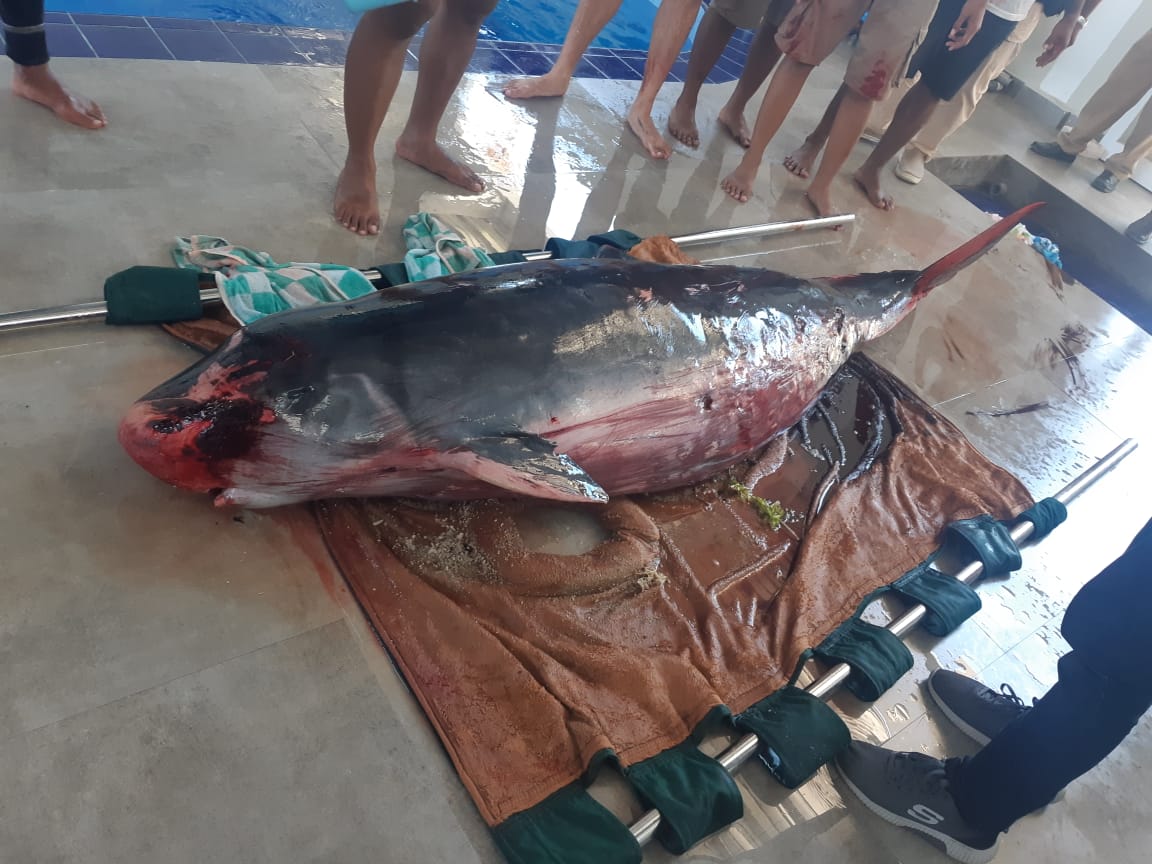 Paus sperma kerdil dengan panjang hampir 3 meter dan lingkar perut 1,37 meter ini ternyata menghembuskan energi terakhirnya sepuluh menit sebelum tiba di lokasi evakuasi. Hanya beberapa menit setelah diangkat dari pantai. “Terlihat luka lama dan baru di badannya. Kemungkinan digigit satwa laut lain,” lanjut Kanta.