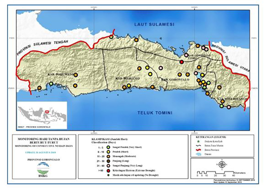 Berdasarkan analisis data Hari Tanpa Hujan (HTH) per 31 Agustus 2019, Badan Meteorologi Klimatologi dan Geofisika [BMKG] Gorontalo, Provinsi Gorontalo mengalami kategori HTH sangat panjang, 31 sampai 60 hari. Pantauannya, di wilayah Mootilango, Telaga, Suwawa Timur, Imana, Kwandang, dan Atinggola.
