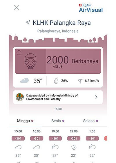 Data AirVisual mencatat, pada 15 September, angka 2000 USAQI tertera yang berarti kondisi berbahaya. Dalam beberapa jam konsentrasi asap berubah, namun tetap di angka berbahaya, di atas 1000. Indeks Standar Pencemaran Udara [ISPU] dengan parameter berbahaya PM10 adalah 500.