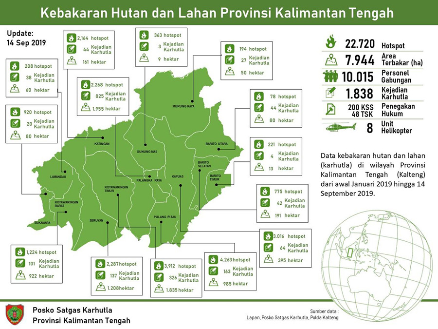 Berdasarkan data Posko Satgas Karhutla Provinsi Kalimantan Tengah, awal Januari hingga 14 September 2019, luas lahan yang terbakar sekitar 7.944 hektar. Jumlah kebakaran sebanyak 1.838 kejadian, hotspot [22.720 titik], dan 200 kasus penegakan hukum dengan 48 tersangka.