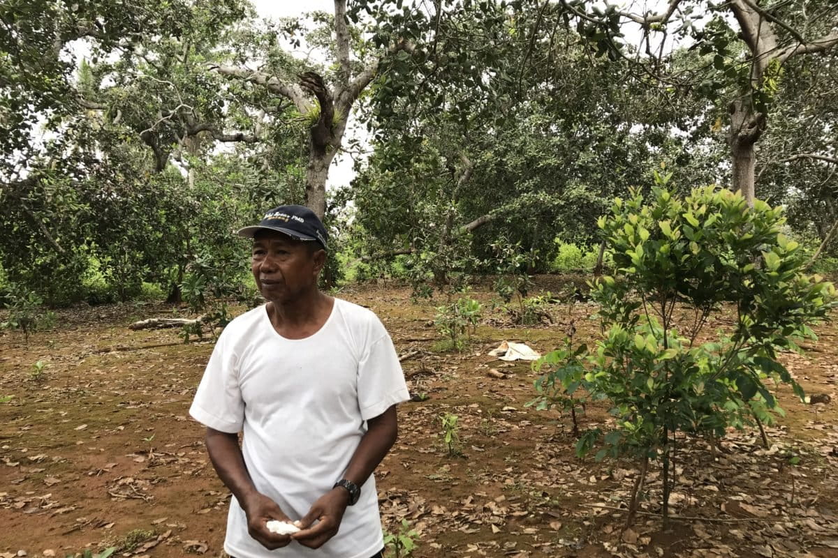 Keterangan foto utama: Abdul Majid, di lahan yang ditumbuhi ratusan pohon mete. Lahan ini tidak mau dia lepaskan kepada perusahaan. Memberikan lahan kepada perusahaan sama dengan bertaruh nyawa. Foto: Kamarudin/ Mongabay Indonesia