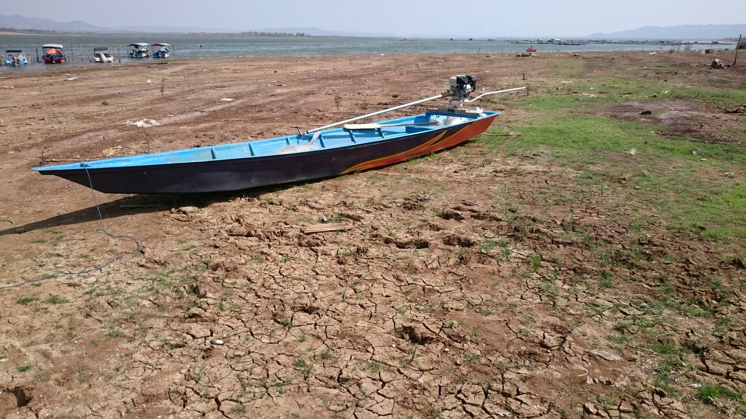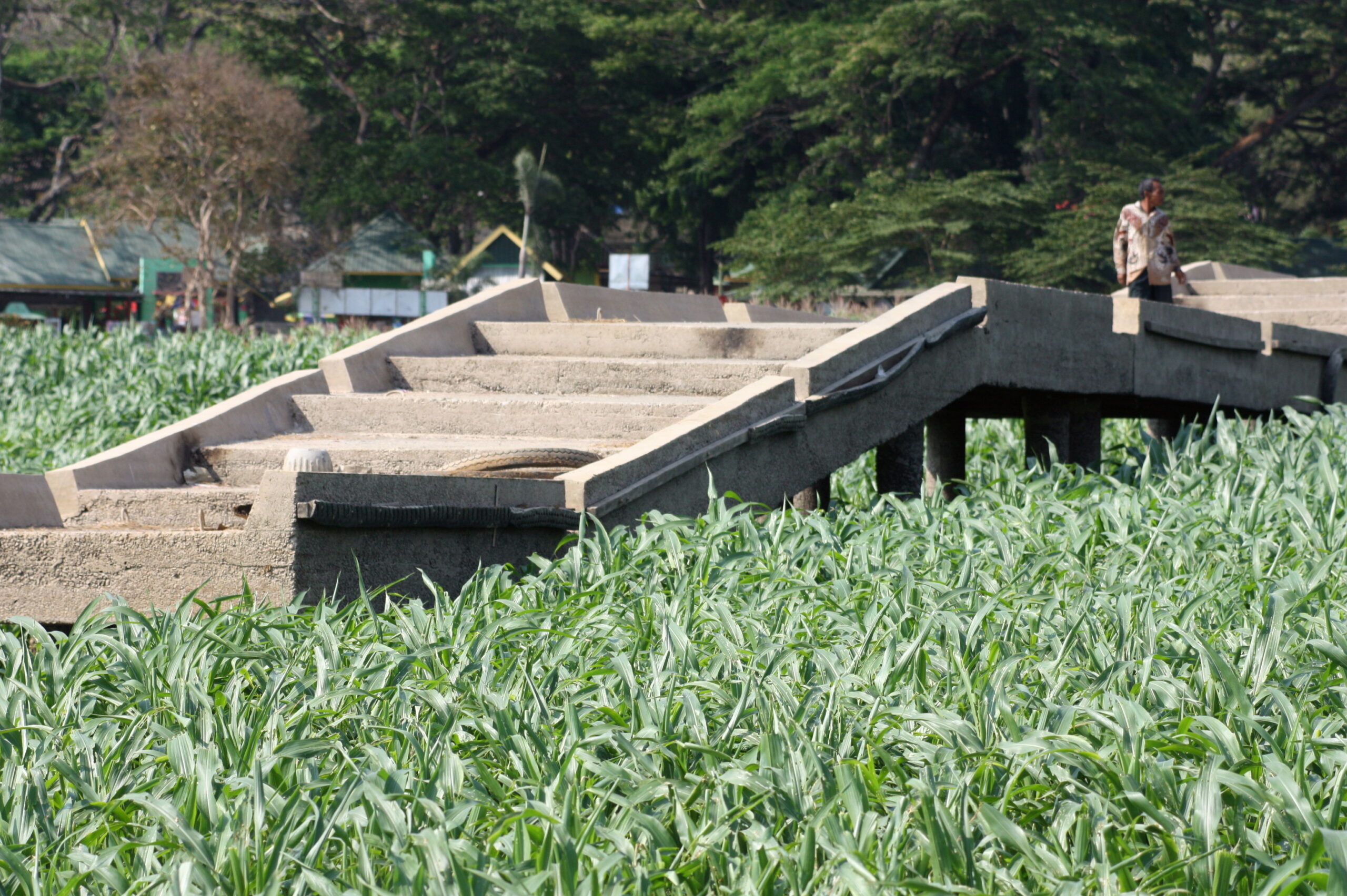 Tak jauh dari mereka teronggok bangkai sampan di tengah lahan. Dekat bibir waduk, ada dermaga yang terlihat seperti menggantung di atas tanaman jagung. Air waduk surut membuat dermaga itu kering, tak bisa didekati perahu maupun kapal motor.