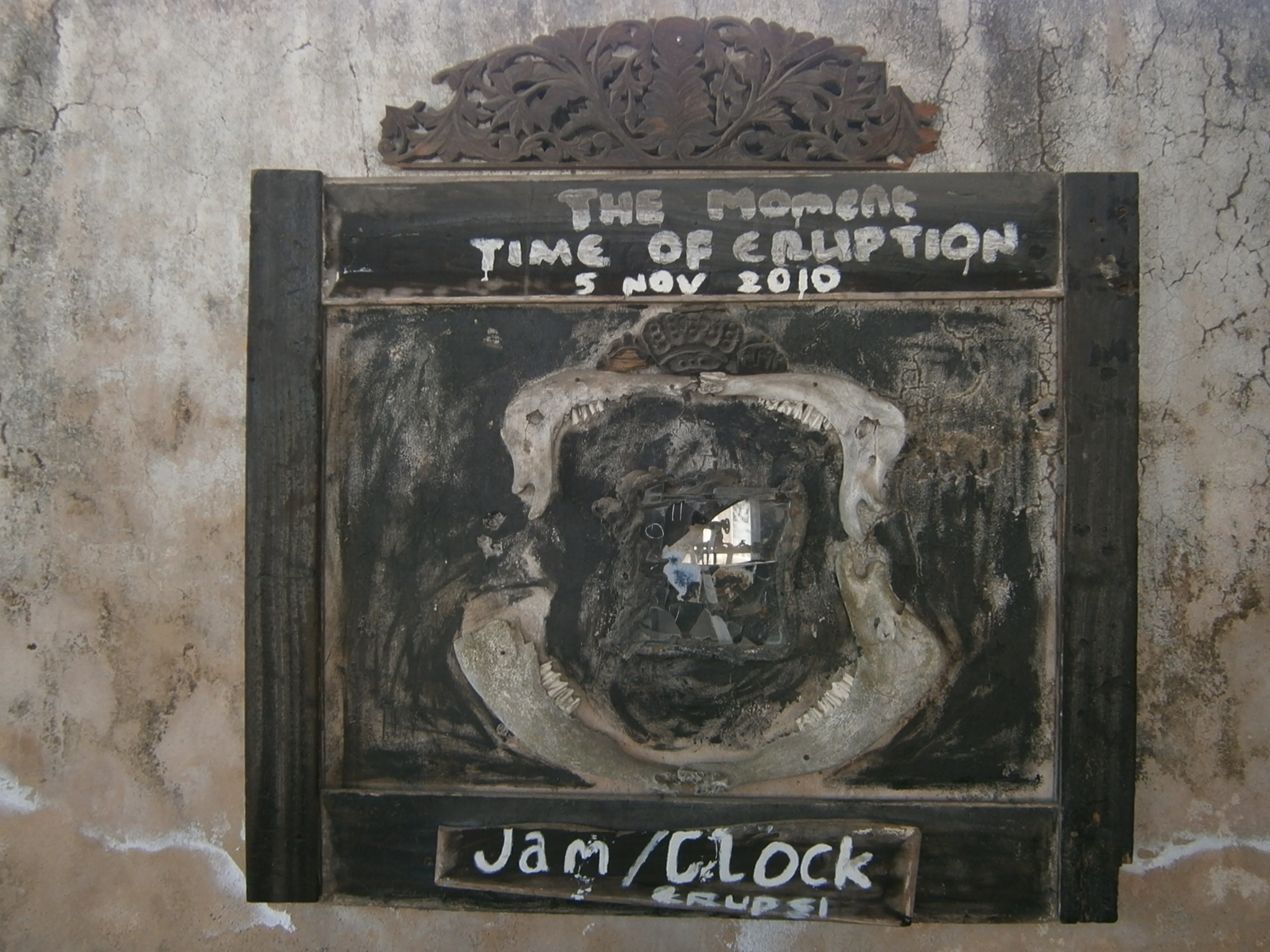 Bayu dan dua tamu tiba di ruang tengah. Di hadapan mereka tergantung jam dinding yang sudah meleleh laksana lukisan surealis Salvador Dali. Ada tulisan The moment time of eruption, 5 November 2010.