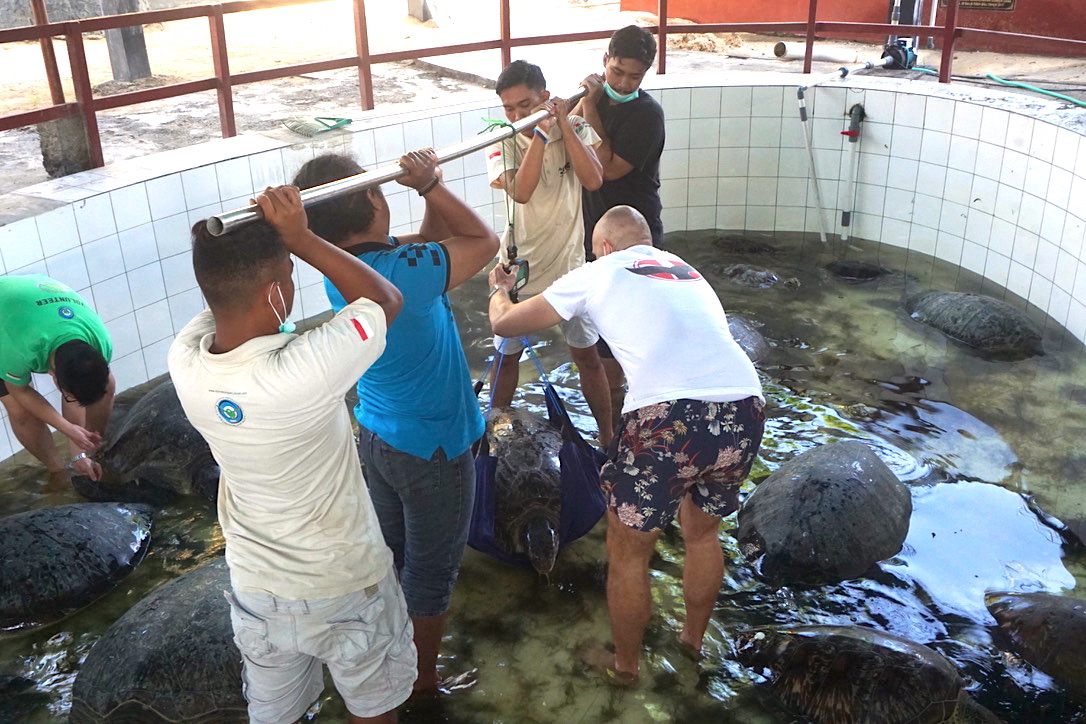 Pada Rabu (2/10/2019) seorang dokter hewan di TCEC dibantu sejumlah mahasiswa sedang mengumpulkan sampel jaringan tiap penyu untuk tes DNA. Secuil flippers dipotong dan jadi sampel pemeriksaan. Aidil Calvianto, relawan Turtle Guard, komunitas dokter hewan pemerhati penyu ini masuk ke dalam kolam besar berisi 12 penyu ukuran besar untuk mengambil sampel.
