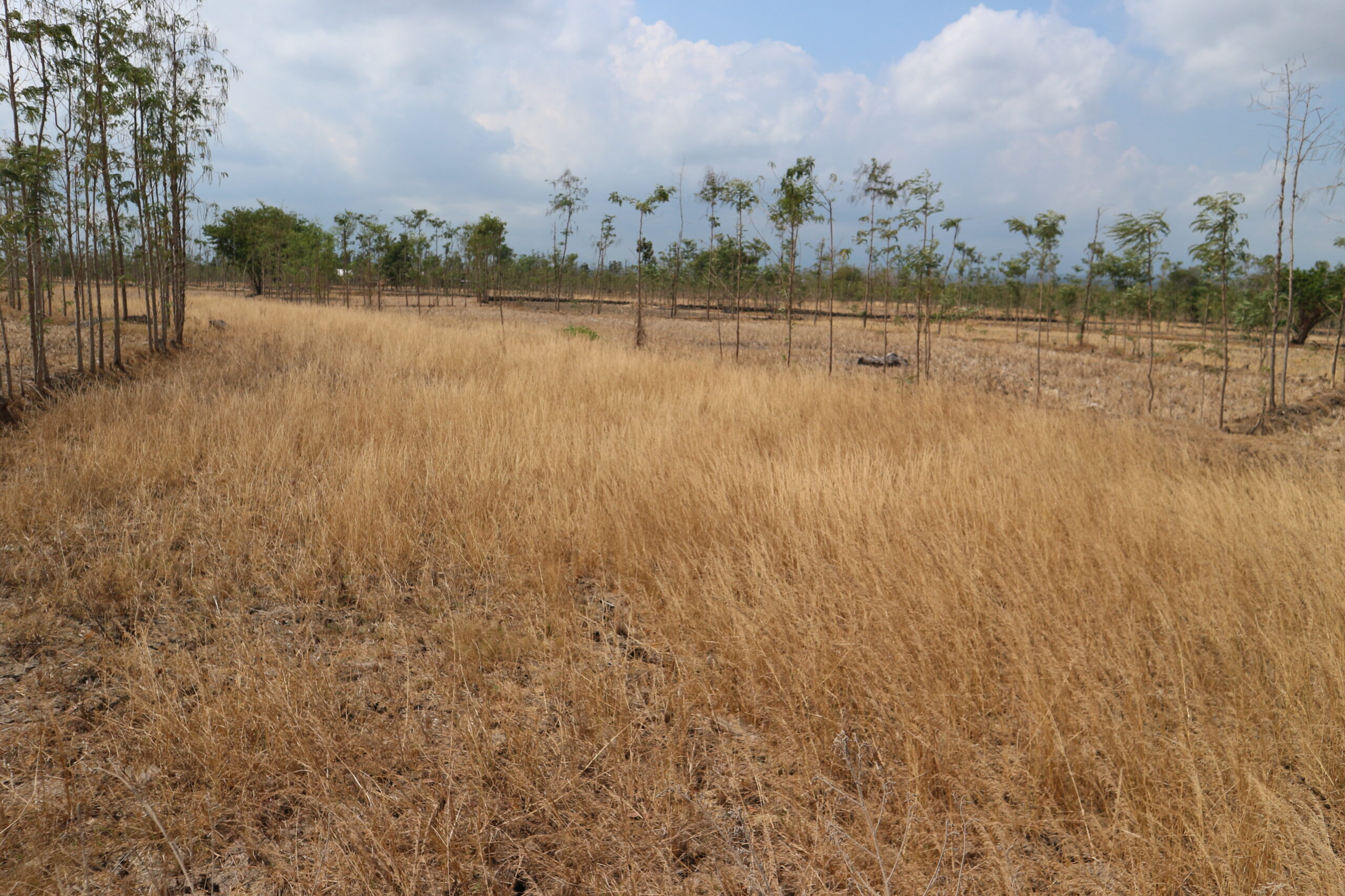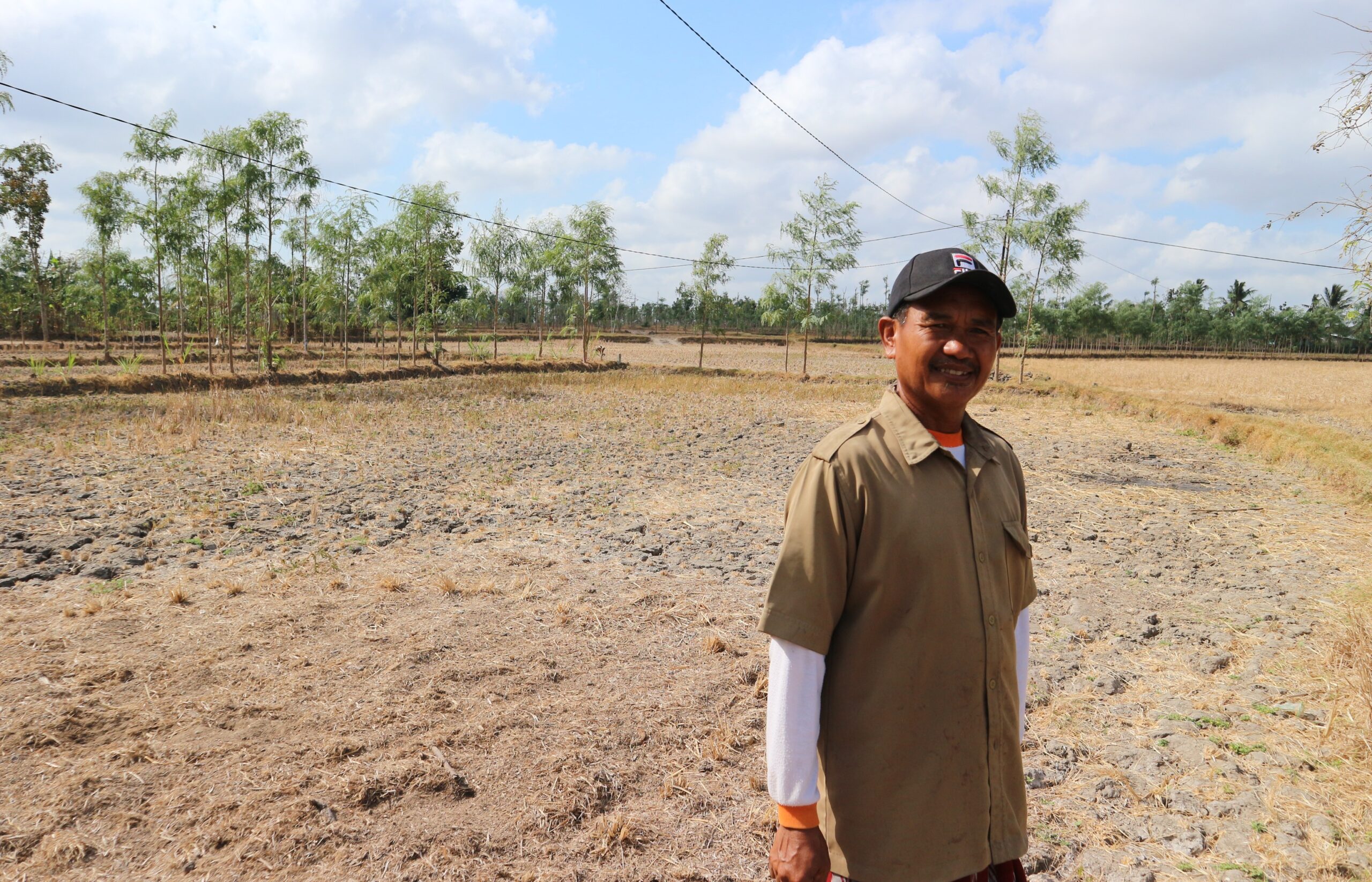 Tanaman mengering bak batang padi sisa panen. “Itu tanaman padi. Bukan [sisa] panen.” Dia menunjukkan lahan lain bekas panen. Tanah retak, merekah. Di sela-sela tampak batang padi sudah terpotong.