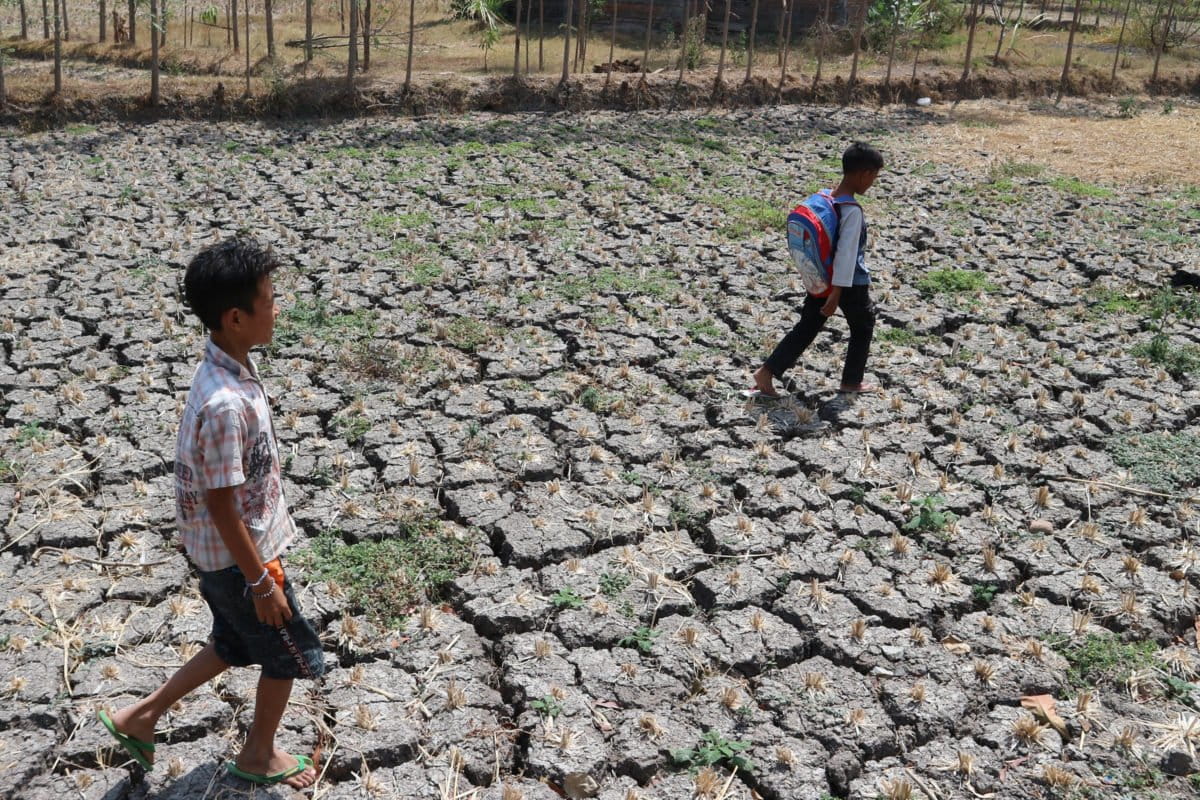 Dua anak di Desa Batujai, Kecamatan Praya, Kabupaten Lombok Tengah, bermain di sawah yang kering. Terlihat rekahan tanah karena kemarau panjang. Sebagian besar petani di desa ini tak menanami sawah mereka dan sebagian gagal panen. Foto: Fathul Rakhman/Mongabay Indonesia
