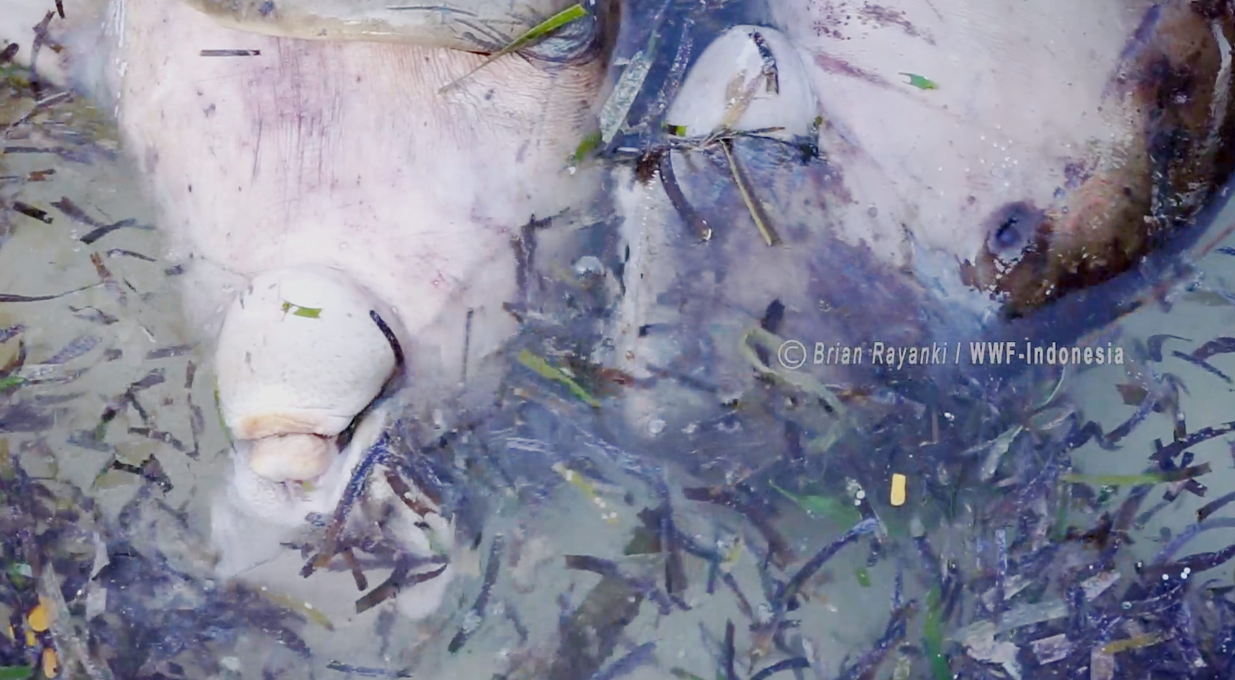 - Dua ekor dugong mati tersangkut jaring nelayan, di Ur Pulau, Kepulauan Kei Kecil, Kabupaten Maluku Tenggara, Minggu (20/10/2019). Sebelumnya, seekor penyu raksasa juga ditemukan nelayan tersangkut di jaring belum lama ini.