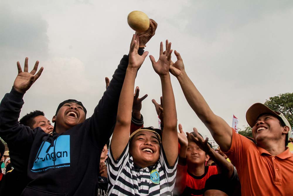 - Ribuan orang menyaksikan dan menikmati buah-buahan gratis pada acara bertajuk “Festival Latukan Pesta Buah” di lapangan sepak bola Desa Latukan, Kecamatan Karanggeneng, Kabupaten Lamongan, Jawa Timur, Minggu (03/11/2019).