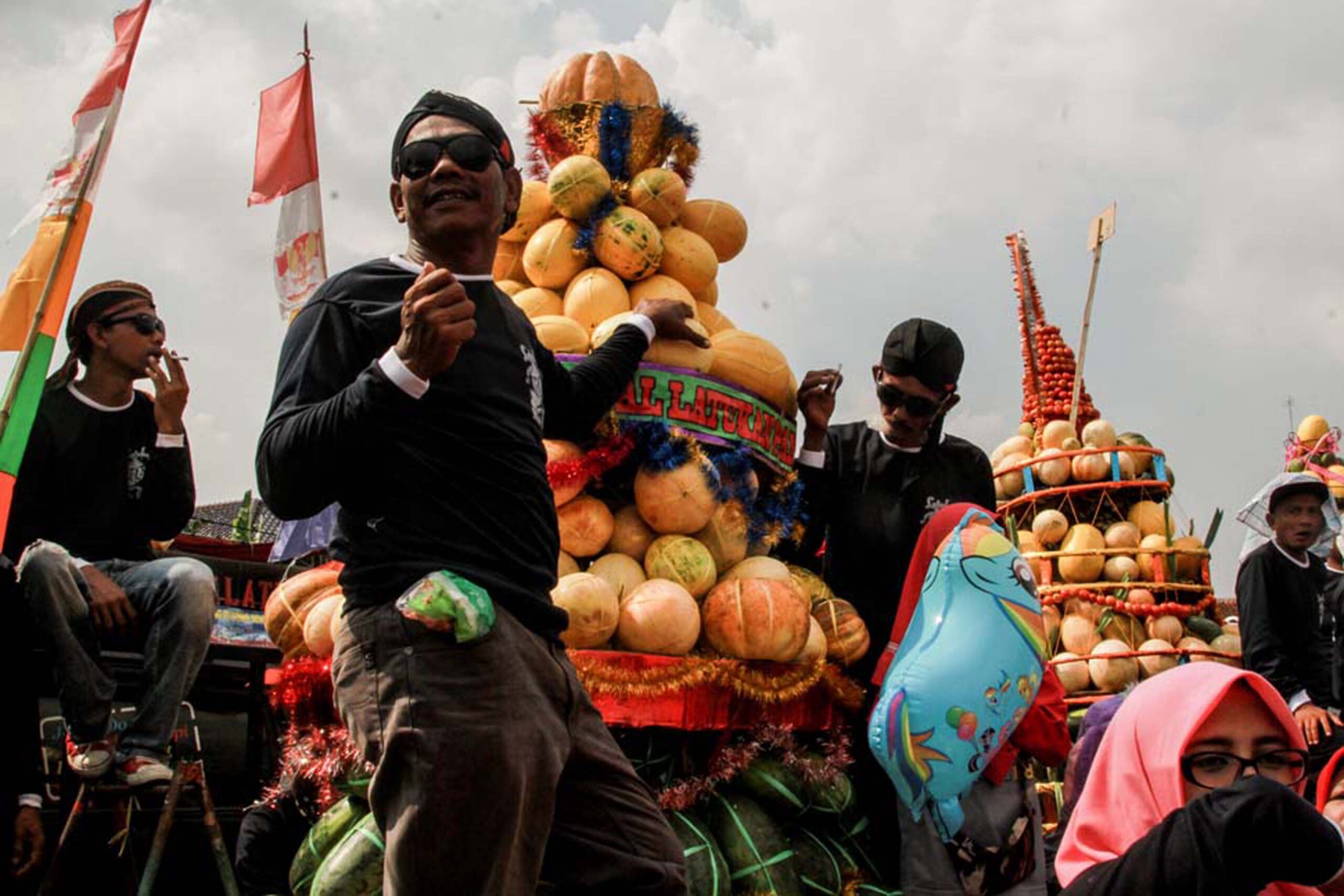 Selepas itu, pengunjung bisa menyaksikan atraksi arak-arakan pawai buah yang berasal dari sumbangan dan partisipasi warga setempat, “Ada 15 Gunungan yang diarak dengan menggunakan pikap, kemudian berhenti di lapangan, lalu diberikan secara gratis ke masyarakat yang datang berkunjung,” ujar Arif Nur Hidayat, selaku ketua pelaksana.
