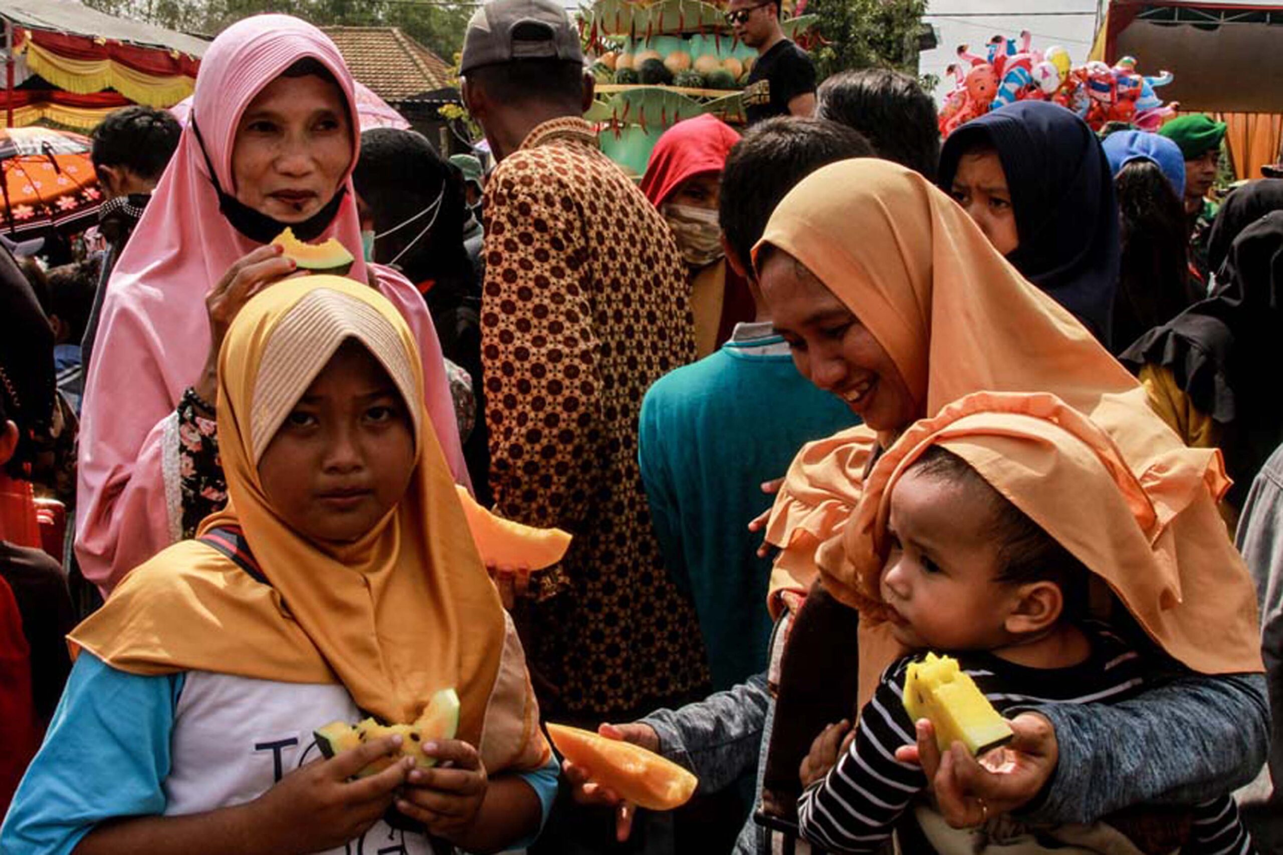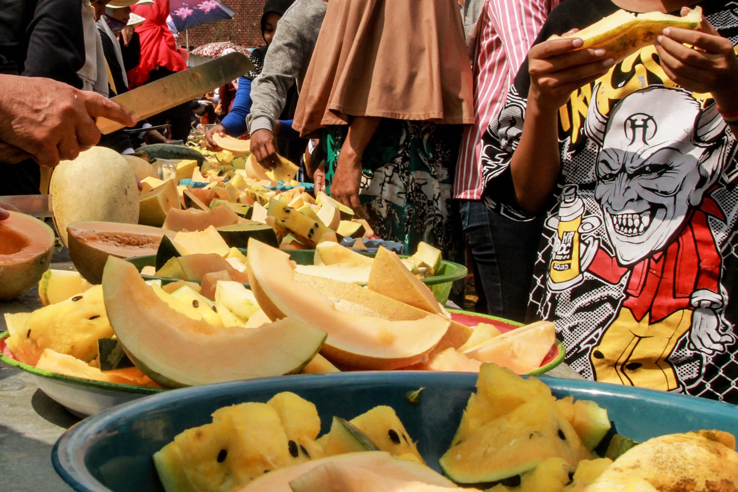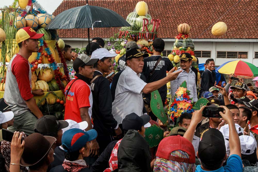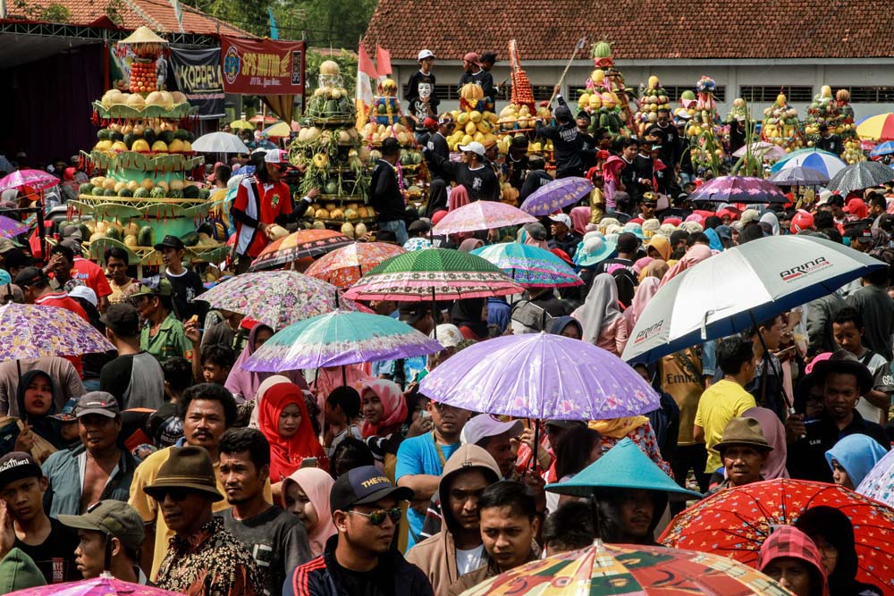 Mendung yang bergelayut tidak menyurutkan antusias wisatawan datang berkunjung. Siang beranjak sore, ribuan wisatawan tumpah ruah di lapangan sepak bola meski gerimis tiba. Sambil menunggu pejabat yang akan datang, para pengunjung bisa mencicipi aneka buah semangka, melon, dan sunrise. Buah tersebut diambilkan oleh panitia dari gunungan setelah diarak, buah itu kemudian di potong-potong dan dibagikan ke pengunjung secara gratis. Di sudut lain, tampak puluhan stan memamerkan produk Usaha Mikro Kecil dan Menengah (UMKM), ada juga yang menjual buah-buah unggul hasil panen petani desa setempat.