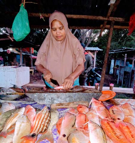 Ningsih, sehari-hari bisa menjual 100 kilogram beragam macam ikan. Suami dan dan kakak iparnya yang menangkap ikan pakai jubi (panah ikan-red). “Yang saya jual ini sebagian besar ikan karang. Dapat dari bajubi,” katanya baru-baru ini.