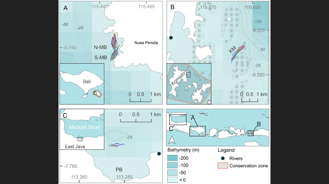 Tiga lokasi terpisah di Jawa dan Pulau Sunda Kecil di Indonesia yang sering dikunjungi dengan memberi makan pari manta dan hiu paus dipilih sebagai lokasi studi. Teluk Manta atau Manta Bay (MB) di dalam Kawasan Konservasi Perairan (KKP) Nusa Penida (MPA) di tenggara Pulau Bali dan Karang Makassar (KM) di kawasan tengah TN Komodo (NP), Flores. Pantai Bentar (PB), sebelah tenggara Probolinggo, Jawa Timur adalah tempat mencari makan hiu paus musiman (Desember-Maret).