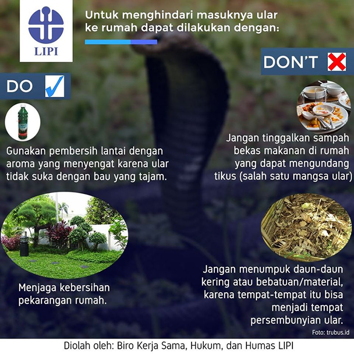 - Untuk menghindari masuknya ular, kebersihan rumah harus selalu dijaga. Jangan meninggalkan sampah bekas, hindari tumpukan barang-barang bekas dan bersihkan pekarangan dari timbunan daun kering atau material.