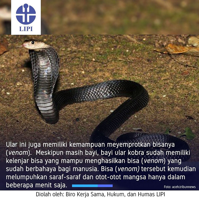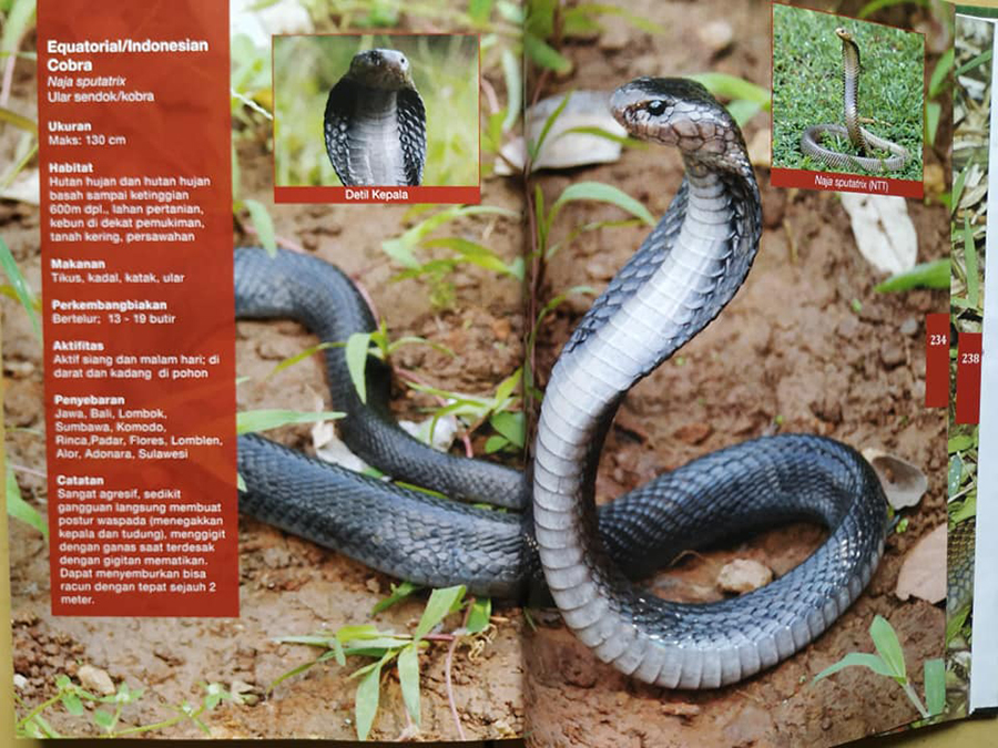 Amir Hamidy, Peneliti Reptil Pusat Penelitian Biologi LIPI, menuturkan, ada dua jenis kobra di Indonesia: kobra sumatera [Naja sumatrana] dan kobra jawa [Naja sputarix]. “Kobra sumatera, persebarannya di Sumatera dan Kalimantan sementara kobra jawa di Jawa, Bali, Lombok, Komodo, Rinca, Sumbawa, dan Flores,” terang Amir melalui keterangan tertulisnya di LIPI Cibinong, Kamis [12/12/2019].
