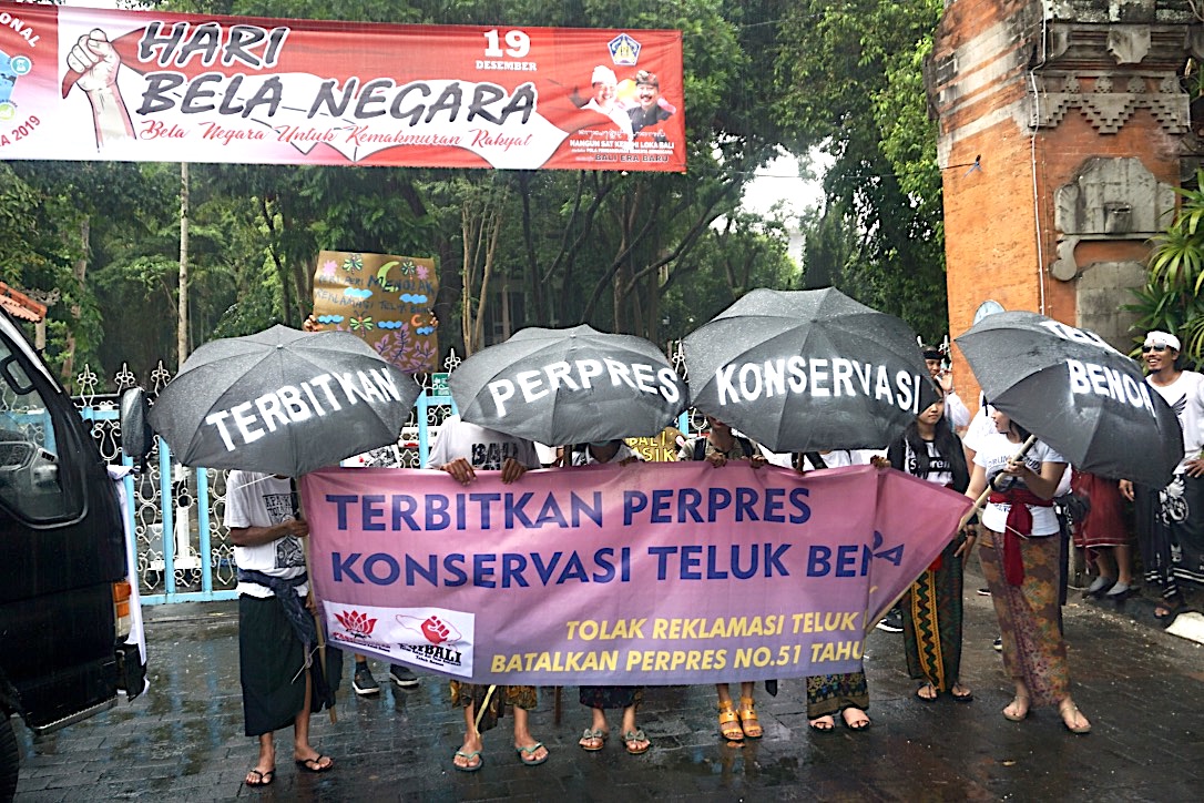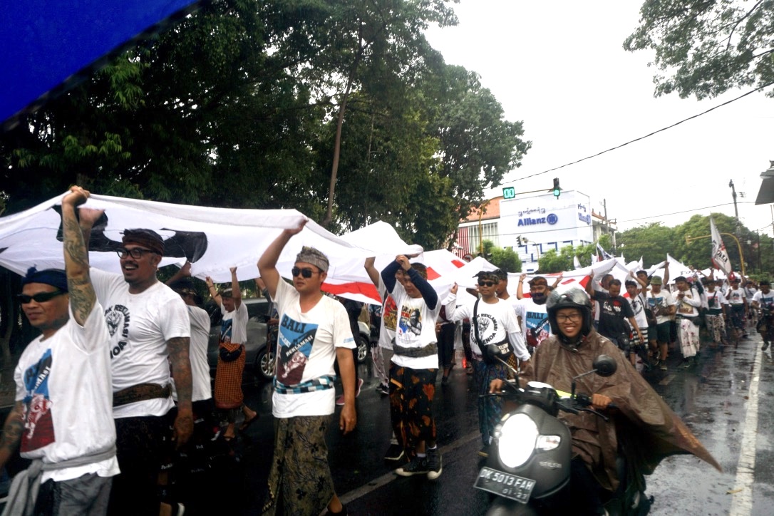 Empat payung hitam bertuliskan Terbitkan Perpres Konservasi Benoa tak hanya jadi dekorasi parade gerakan Forum Rakyat Bali Tolak Reklamasi Teluk Benoa (ForBALI). Tetapi juga pelindung dari hujan yang akhirnya mendinginkan suhu panas di Kota Denpasar lebih dari enam bulan ini.