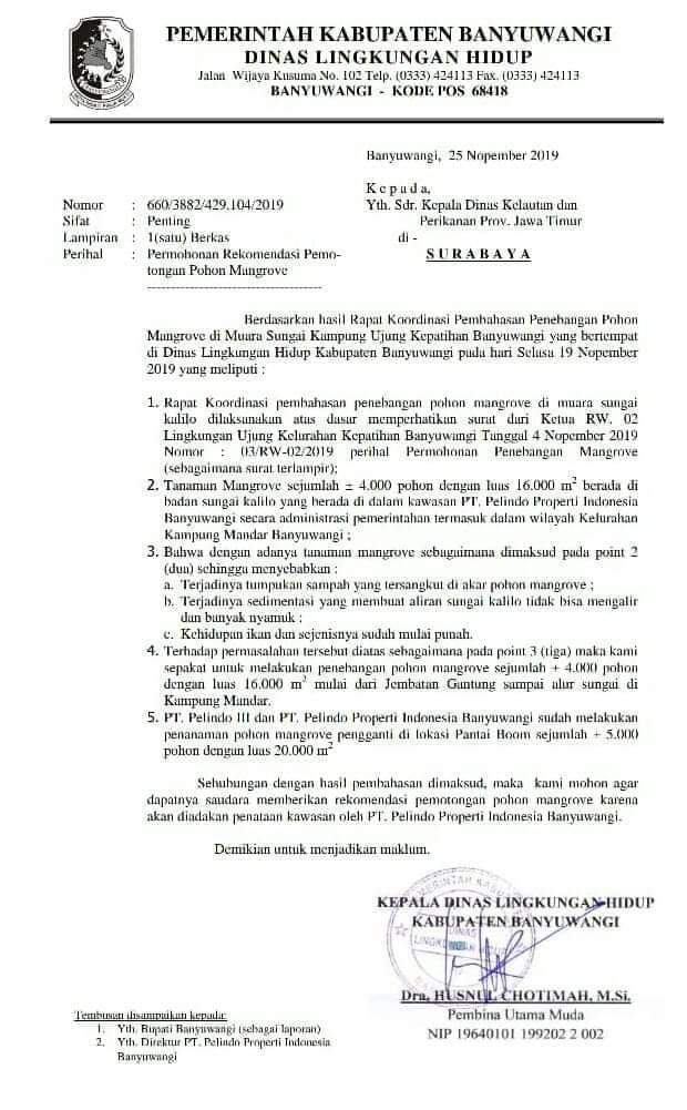 - Surat tertanggal 25 November 2019 meminta, rekomendasi memotong mangrove, dengan alasan pepohonan ini menyebabkan tumpukan sampah. Padahal, katanya, selama beberapa tahun, para pegiat lingkungan Banyuwangi malah menanam, dan menjaga 4.000 ribuan mangrove di sepanjang pintu masuk Pantai Boom Banyuwangi.