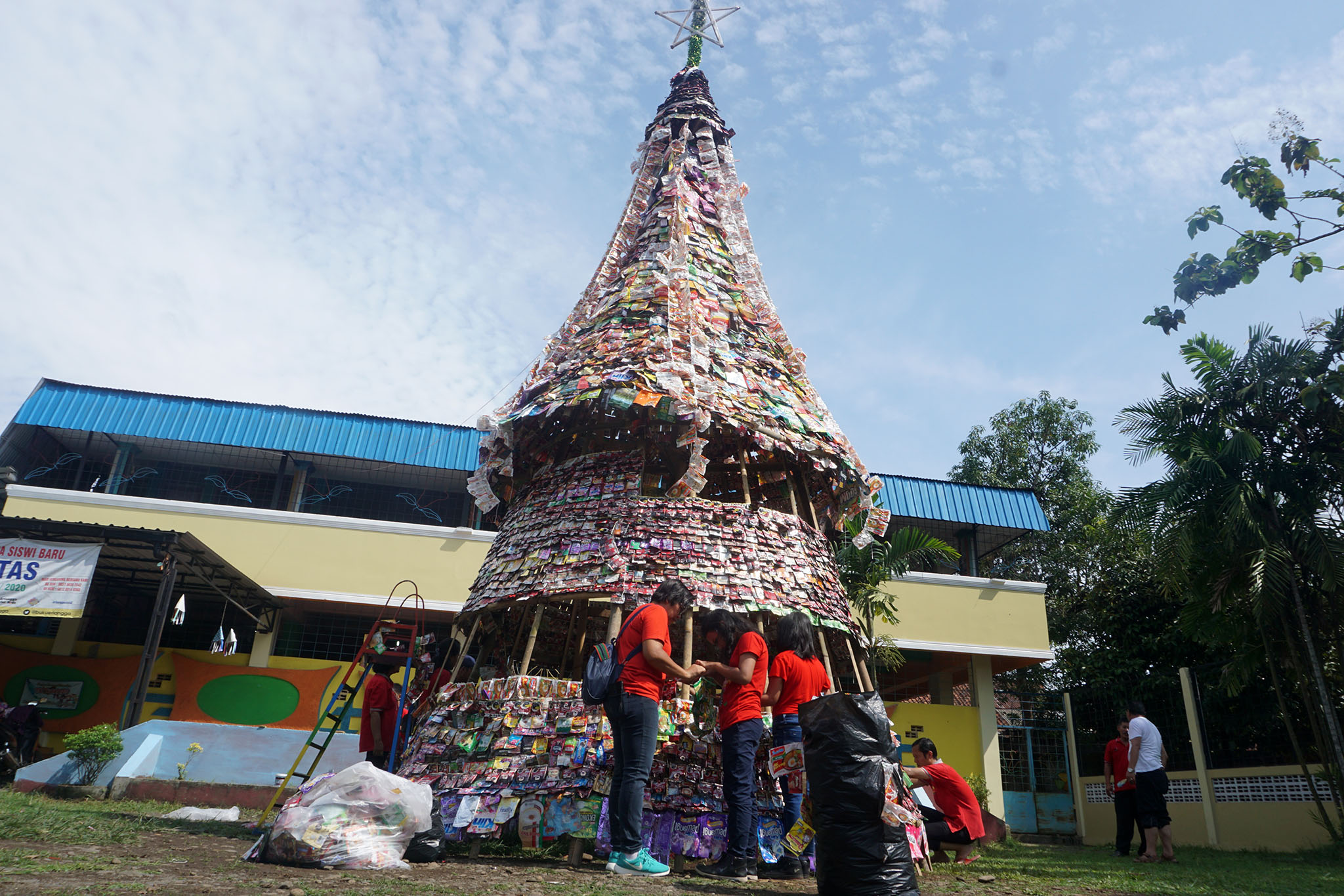 - Sedangkan SD Karitas Purwokerto membuat pohon natal setinggi 8,6 meter dan diameter 4 meter dengan bahan baku limbah plastik