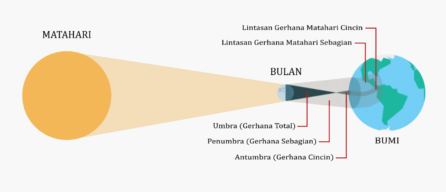 - Gerhana Matahari Cincin, terjadi ketika Bulan menutupi pusat Matahari, meninggalkan tepi terluar Matahari membentuk “cincin api” yang diamati dari permukaan Bumi.