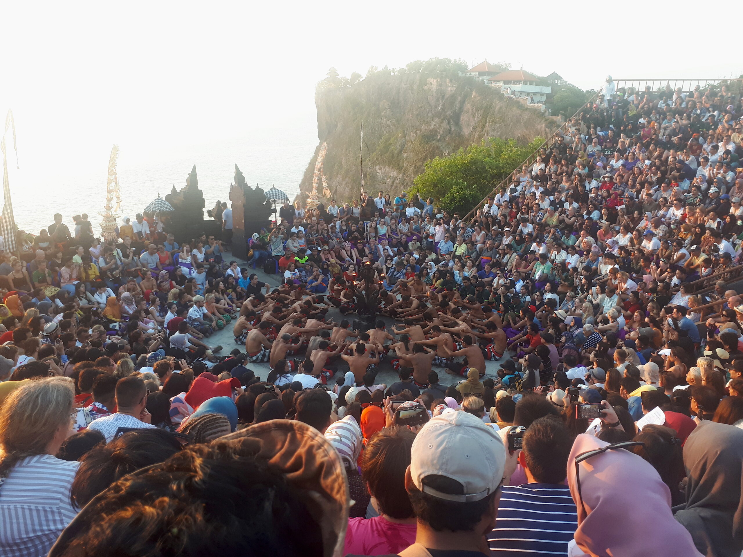 Ribuan turis menunggu matahari terbenam, dan mulai pukul 17.30 WITA sudah berbondong menuju panggung tari Kecak yang menghadap samudera dan titik terbenamnya mentari. Dalam setengah jam, semua tempat duduk penuh sesak, namun petugas terus memasukkan penonton ke dalam arena sampai berdesakkan dengan para penari Kecak. Jenis tarian Kecak memerlukan ruang leluasa karena para penari laki-laki yang bertelanjang dada ini terus bergerak sambil menyanyi. Ditambah penari lain sesuai lakon yang dimainkan, sesuai cerita epos Ramayana.