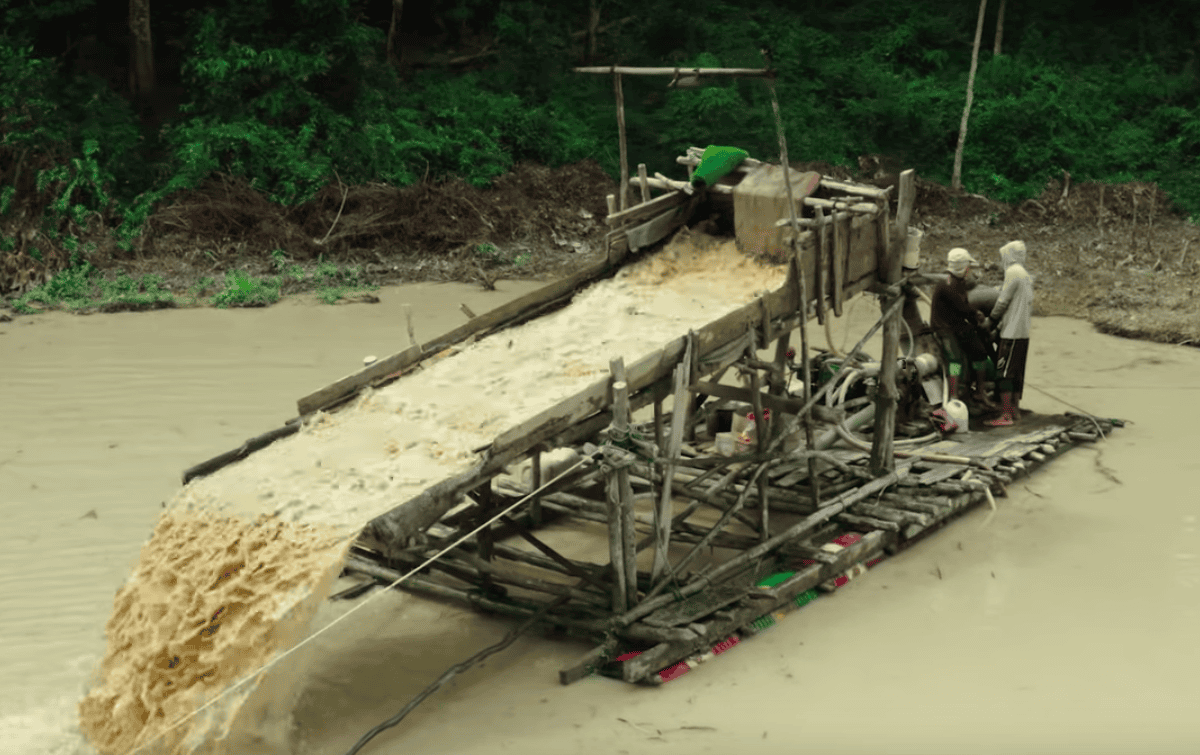 Emas ditambang dengan menggunakan mesin pompa air yang terpasang pada rakit yang terbuat dari kayu dan di bagian bawahnya dipasang beberapa buah drum agar mengapung.