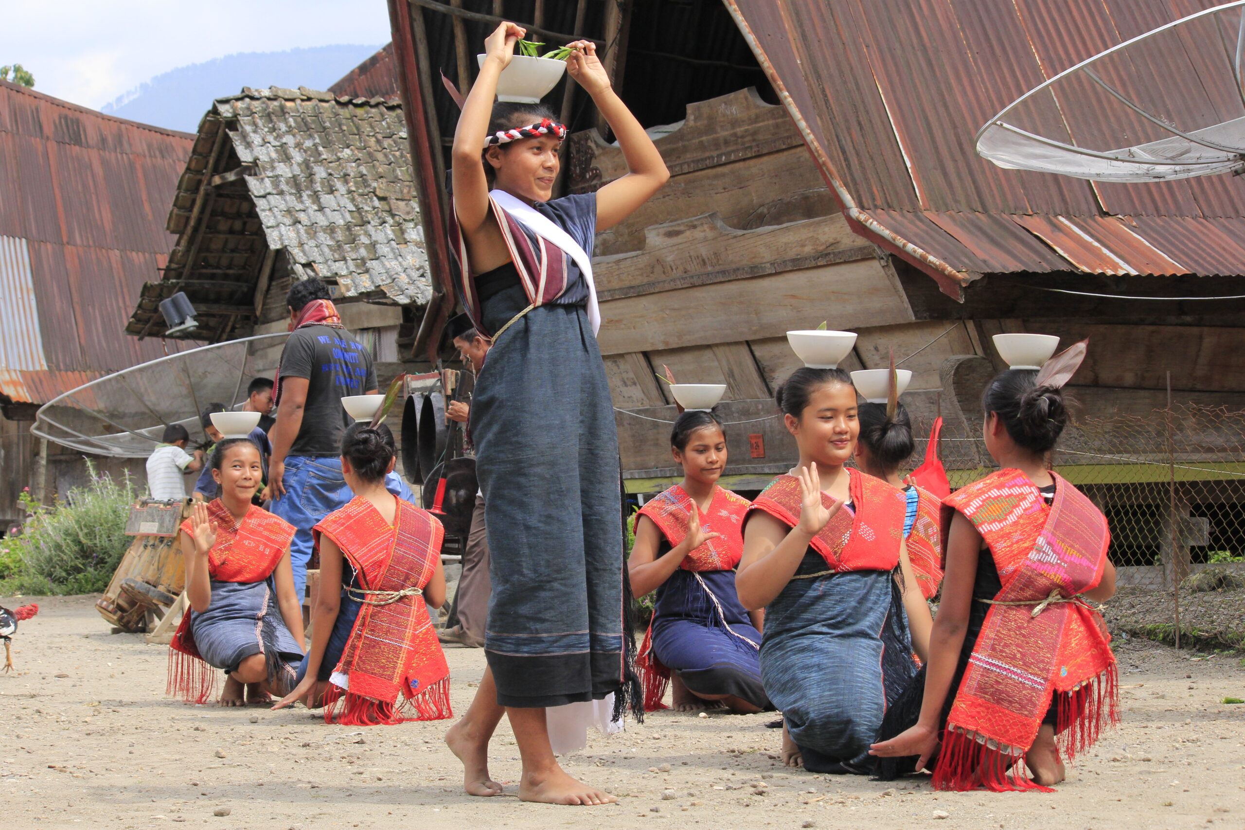 Anak-anak perempuan keturunan Batak Toba Samosir, sore itu tengah berkumpul. Di bawah rumah panggung khas bangunan Batak Toba, terbuat dari kayu, mereka mulai menyelempangkan selendang ulos.