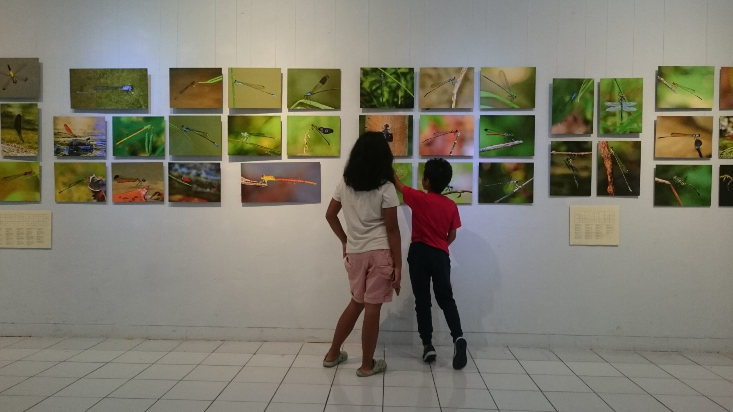 Ya. Kalau melihat ke foto sebelah sana itu (menunjuk ke salah satu deretan foto), saya mencoba menceritakan bagaimana keterkaitan capung dengan habitat. Sebelah kiri adalah capung-capung yang habitat di ruang terbuka. Sebelah kanan, capung-capung yang sangat tergantung habitat naungan. Ada kayu keras, vegetasi beragam, kualitas udara baik.