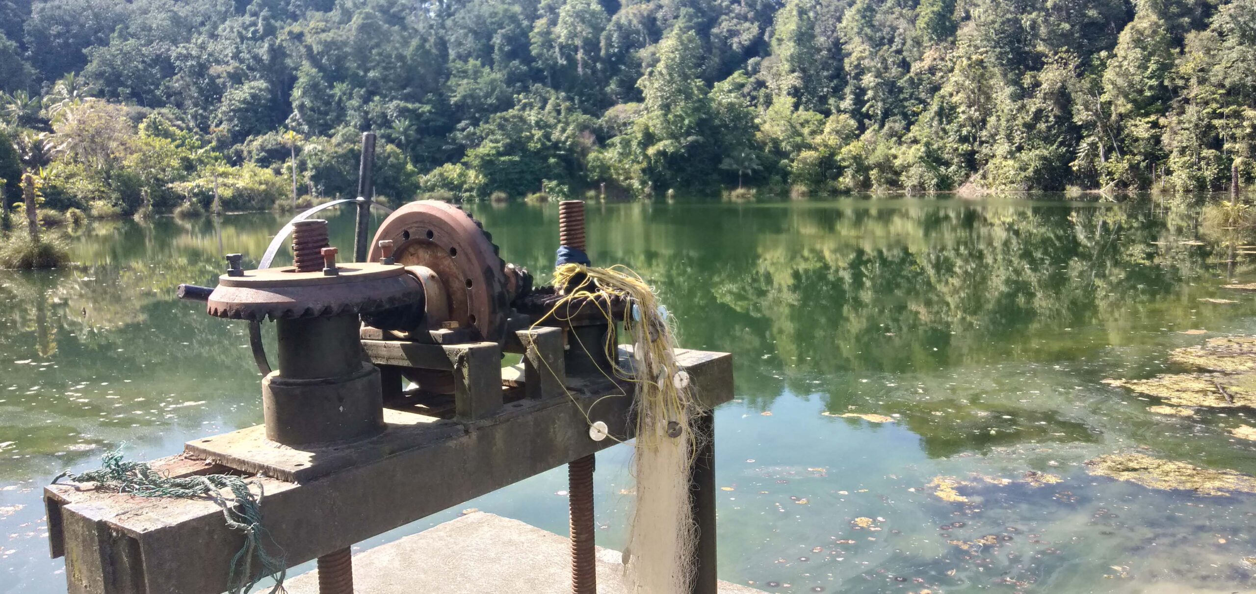 Tampak di ujung telaga berbatasan dengan balai dibangun bendungan dan saluran air. Saluran pertama ke mesin pembangkit listrik, kedua ke kolam-kolam ikan.