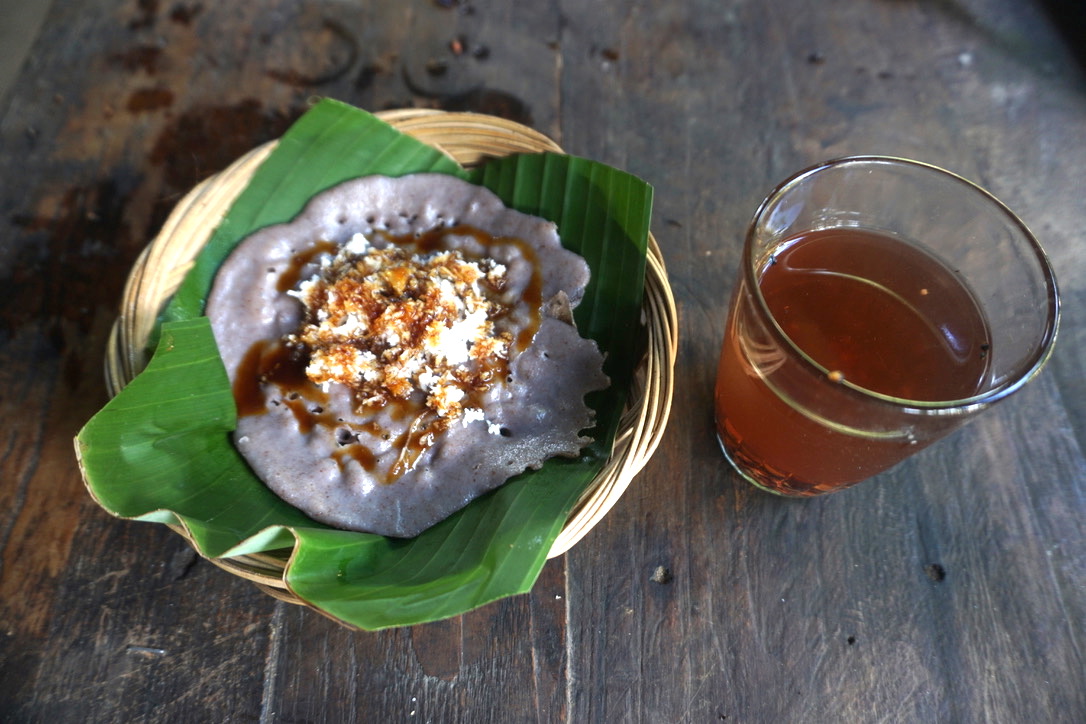 Cetakan besi disiapkan di atas bara api, dan adonan dituangkan dengan tangkas, lalu ditutup penutup tanah liat. Dalam tiga menit, laklak matang. Toping-nya adalah kelapa parut diguyur gula aren. Sarapan pagi di dapur tungku kayu mengurai dingin pagi ditemani teh beras merah. Energi untuk memulai trekking di jalur persawahan sekitarnya.
