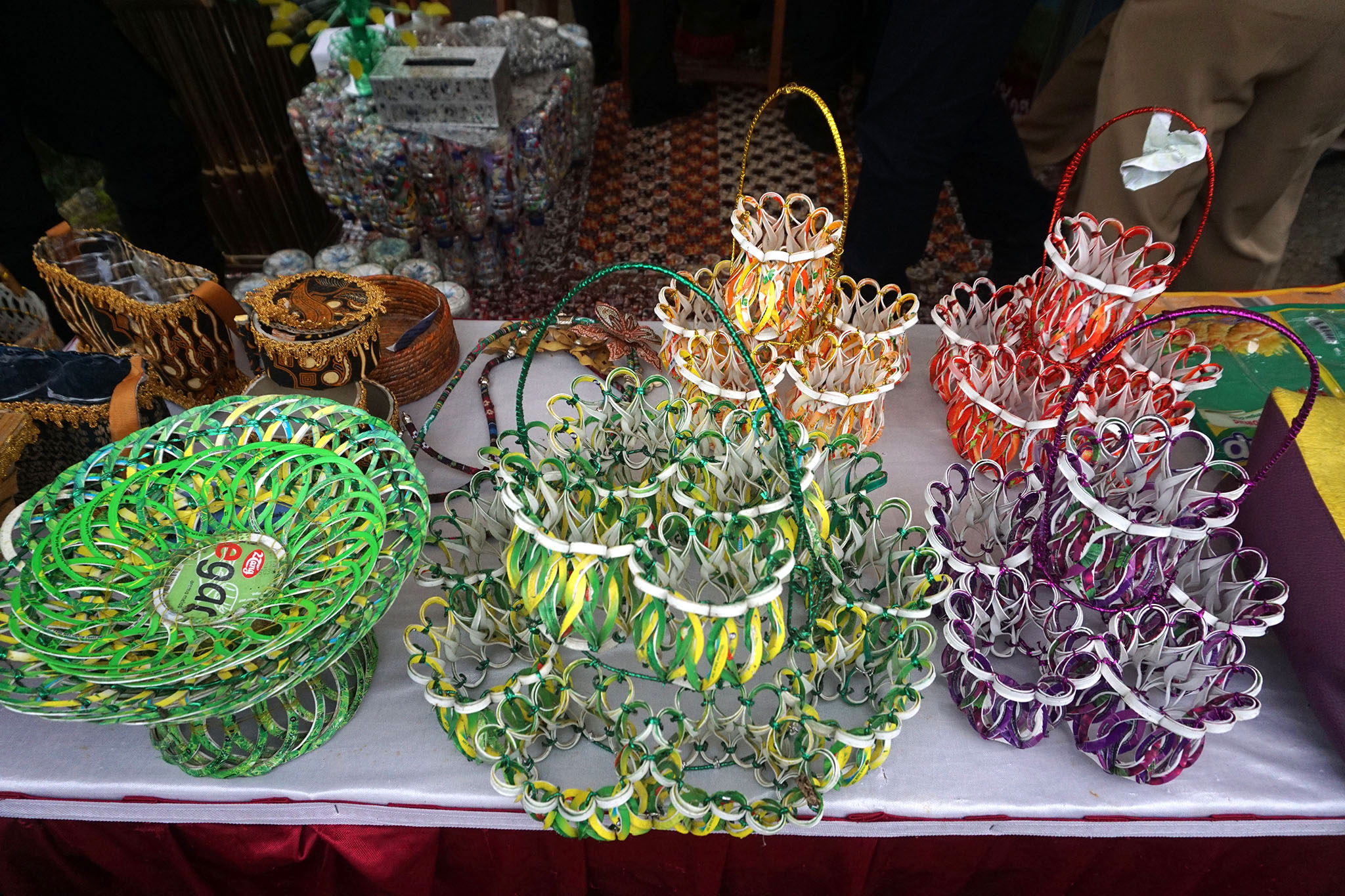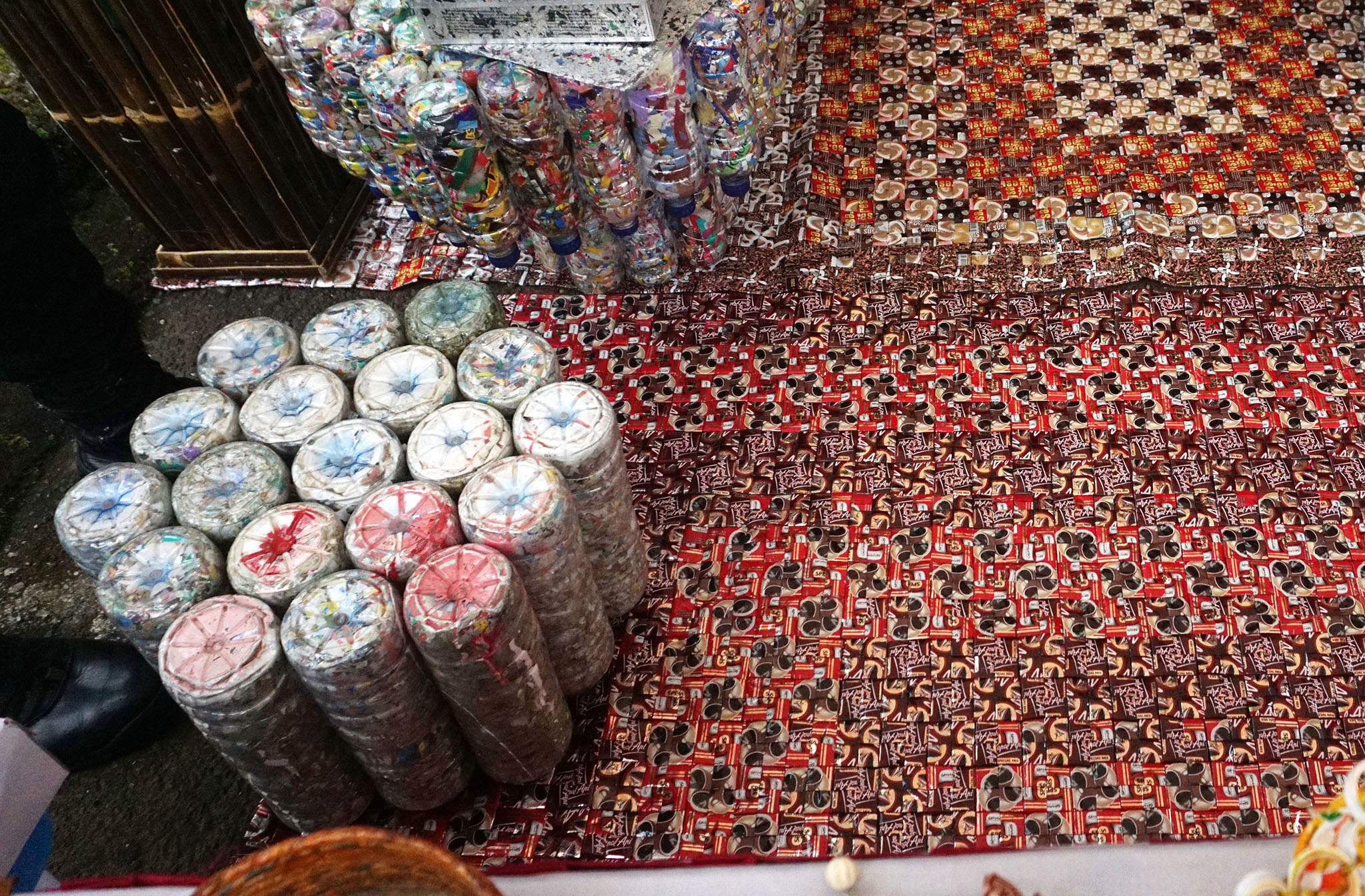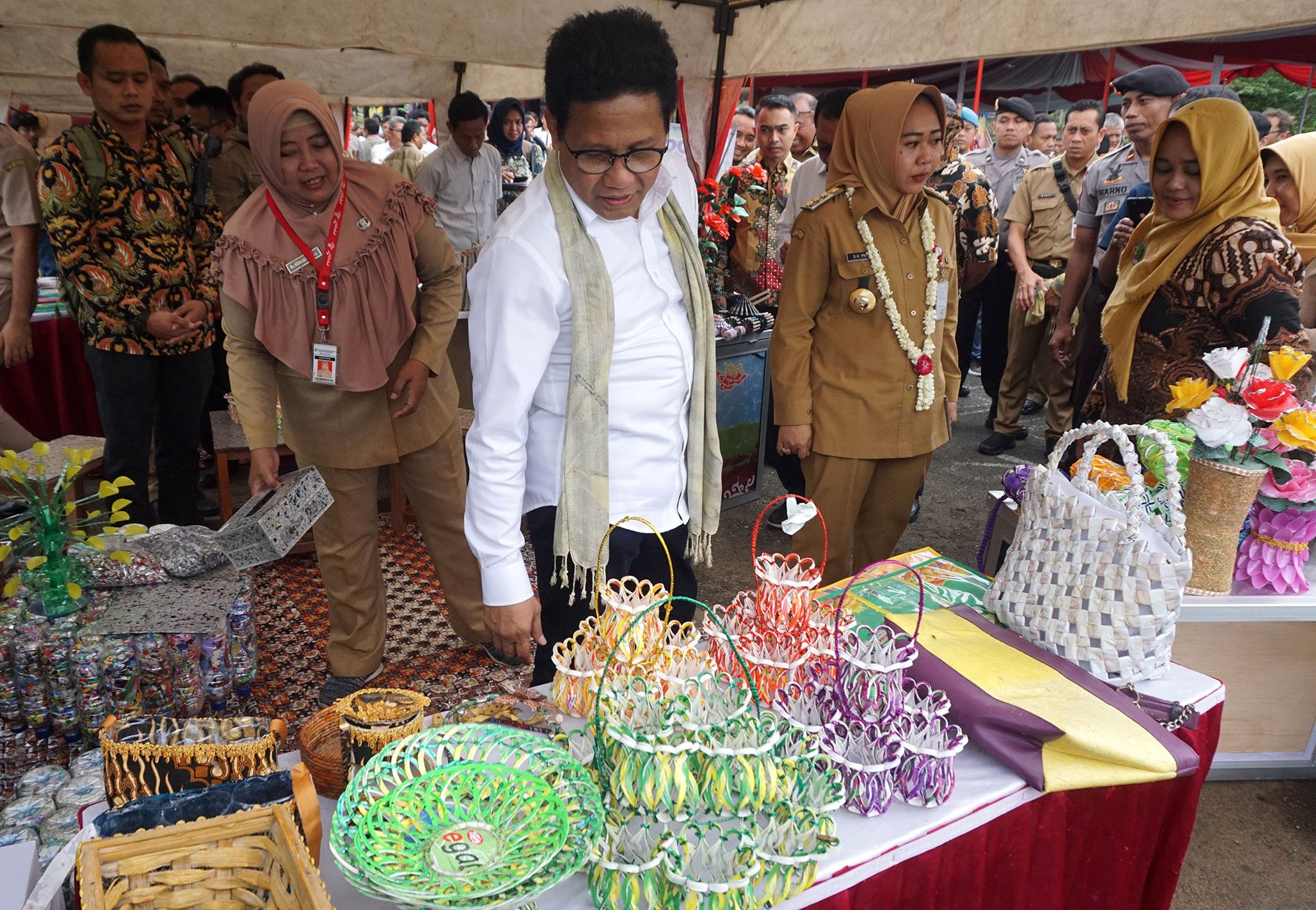 Yang cukup menyedot perhatian Menteri adalah pameran kerajinan yang terbuat dari berbagai macam limbah anorganik. Ada kursi dari bekas botol yang diisi sampah plastik atau ecobricks, kemudian di bawahnya ada karpet dan tikar yang terbuat dari anyaman berkas bungkus kopi dan mi instan, tempat minuman dari bekas botol minuman, dan lainnya.