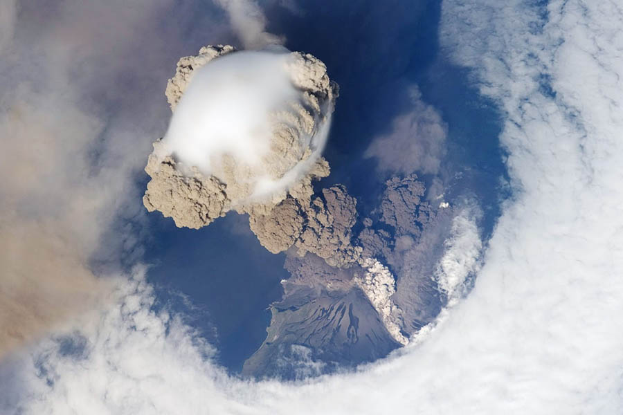 Gunung berapi Sarychev, di Kepulauan Kuril timur laut Jepang yang erupsi pada 12 Juni 2009 yang terpantau International Space Station [ISS]. Foto: NASA/JSC