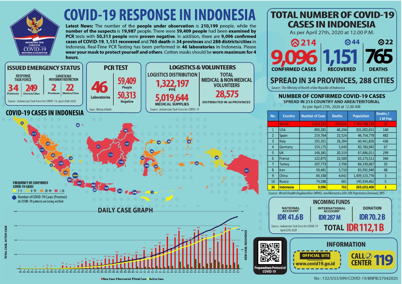 Data pertanggal 27 April, di Indonesia, dari hasil uji spesimen 75.157 metode polymerase chain reaction (PCR) di 46 laboratorium, 59.509 kasus spesimen 9.096 positif dan 50.313 negatif. Sebanyak 765 orang meninggal dunia dan 1.151 sembuh.. Di Sulawesi Barat ada 35 kasus.