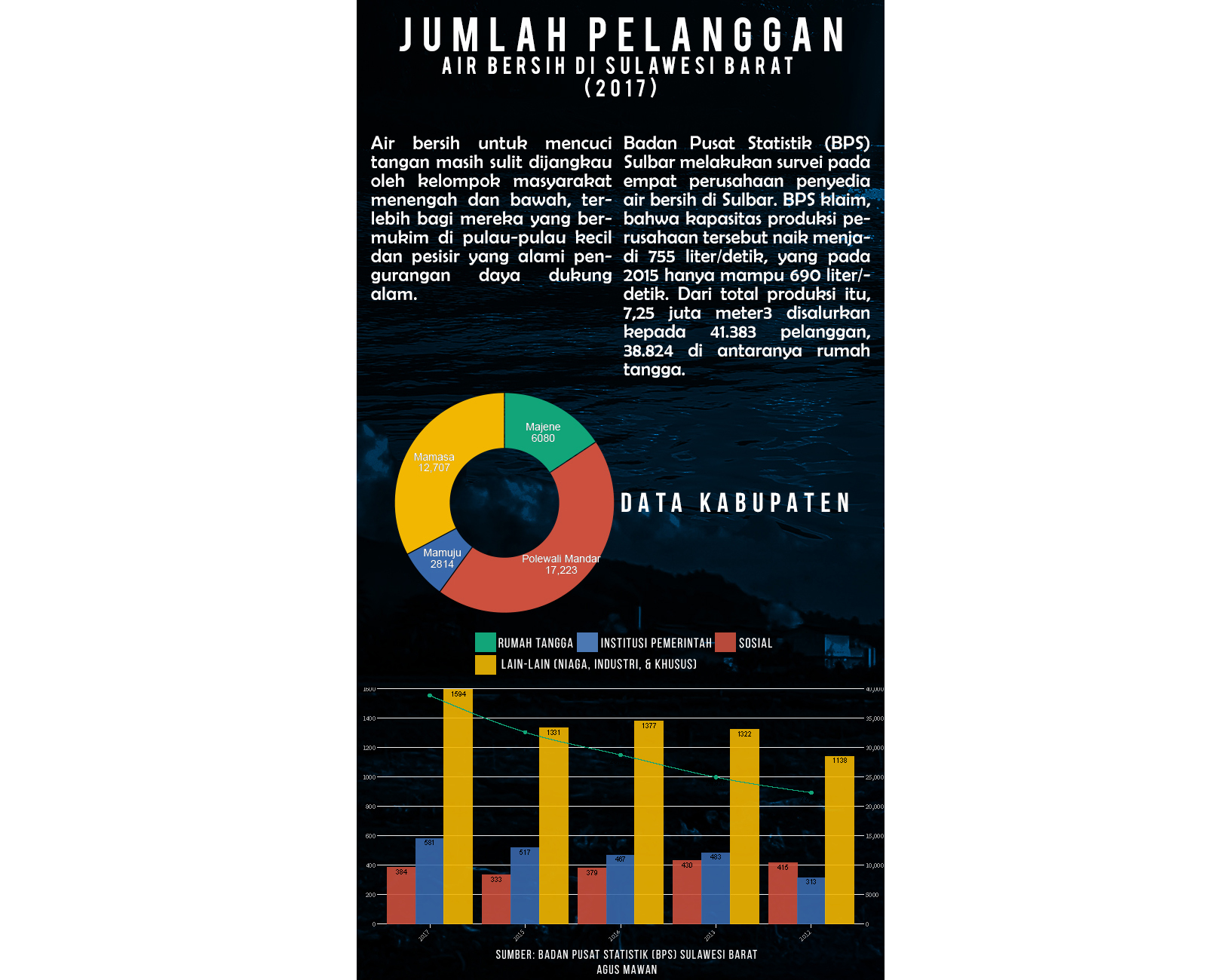 Kendalanya, air bersih barang langka di sebagian tempat. Terlebih bagi mereka yang tinggal di pulau-pulau kecil, pesisir, atau lahan tandus. Akses warga pedesaan untuk air minum layak saja menurut Badan Pusat Statistik (BPS) masih 64.18% pada 2018. Di Sulbar, 57.31%.