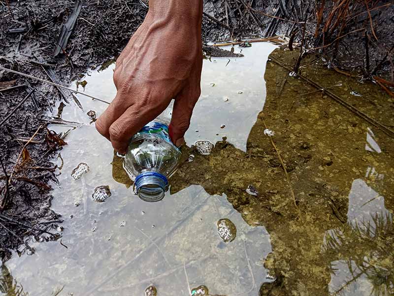 Luasan genangan tumpahan oli pada Rabu [15/4/2020] cukup lebar, dari pantauan Mongabay Indonesia hampir satu hektar. Penyebaran oli terbantu air. Tim Koalisi Langit Biru mengambil sampel oli melalui botol minuman mineral berukuran 330 mililiter. Tampak jelas, oli masih baru, berjenis hidrolik.