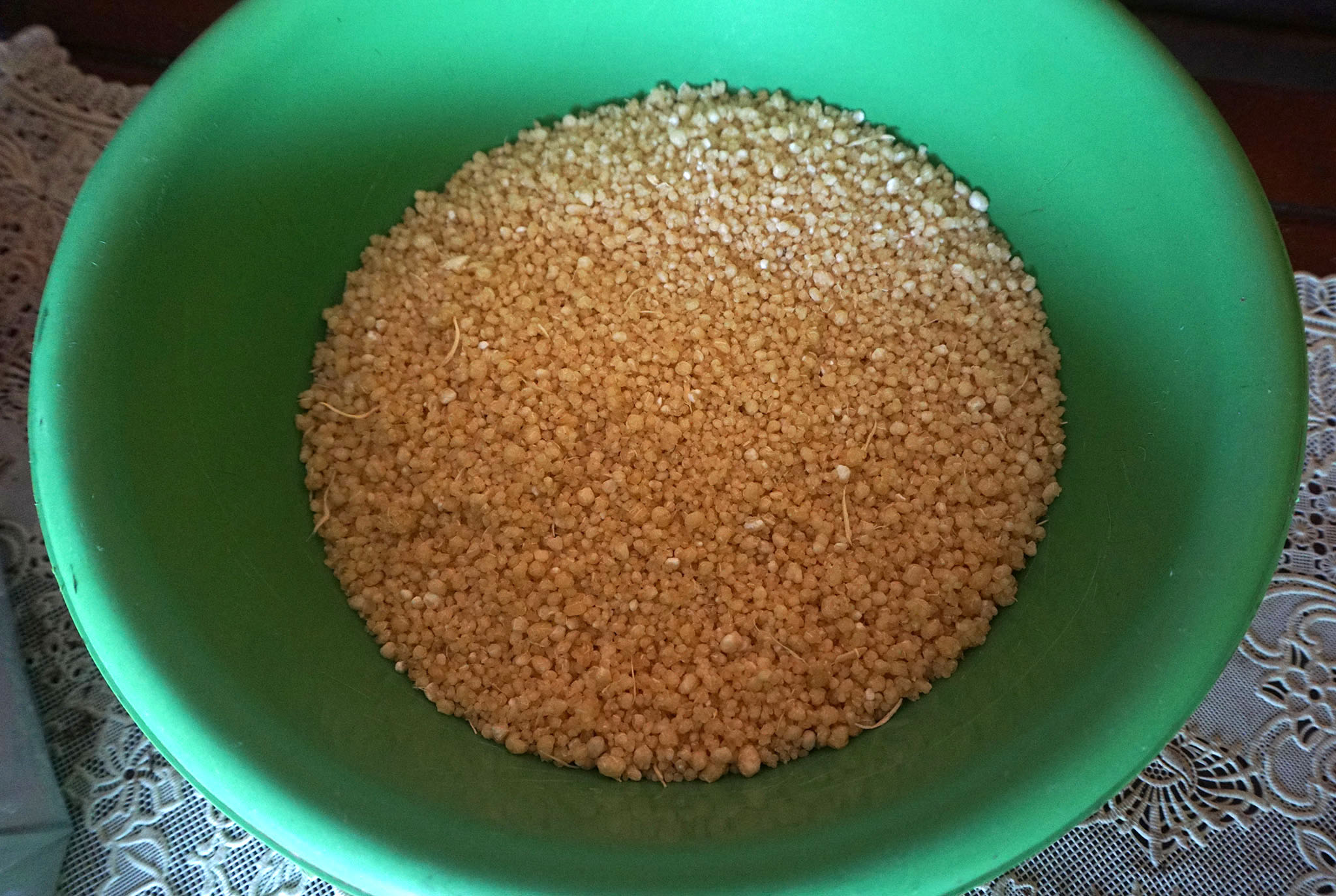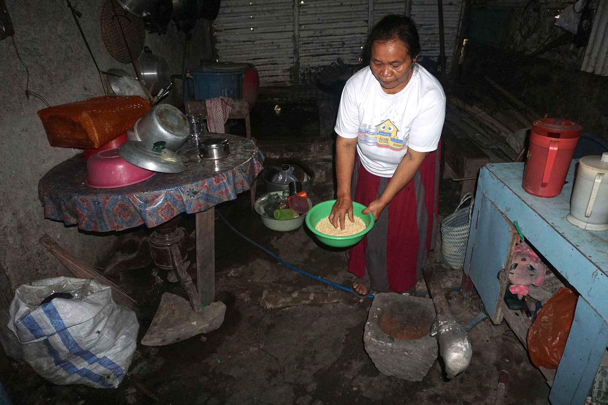 Dapur di bagian belakang rumah Tawen, 60, agak gelap. Sinar matahari hanya sedikit yang menembus dinding kayu. Ia membawa oyek yang diletakkan tidak jauh dari lumpang berikut alu. Kedua alat itulah yang digunakan untuk menumbuk. Biasanya menumbuk singkong yang akan dijadikan oyek.