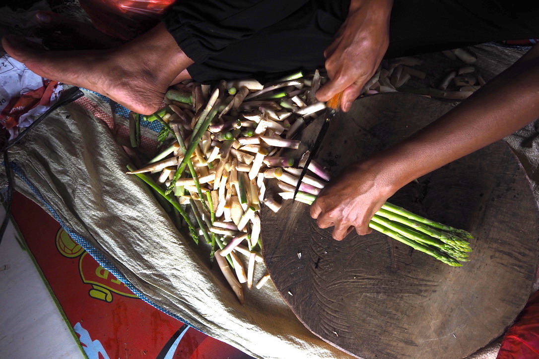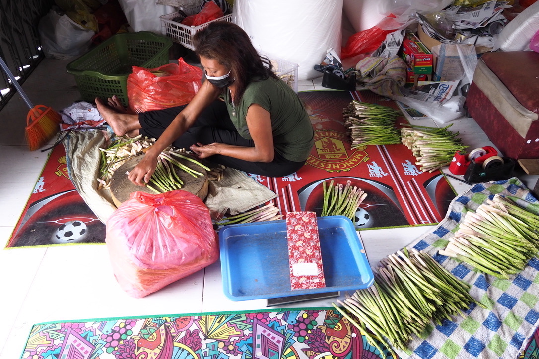 “Sekarang lebih sedikit yang disortir,” kata Suiti. Sambil duduk lesehan di lantai, dia memilih sayur berbentuk tunas muda seperti rebung itu berdasarkan ukuran, merapikan, lalu mengelompokkannya.