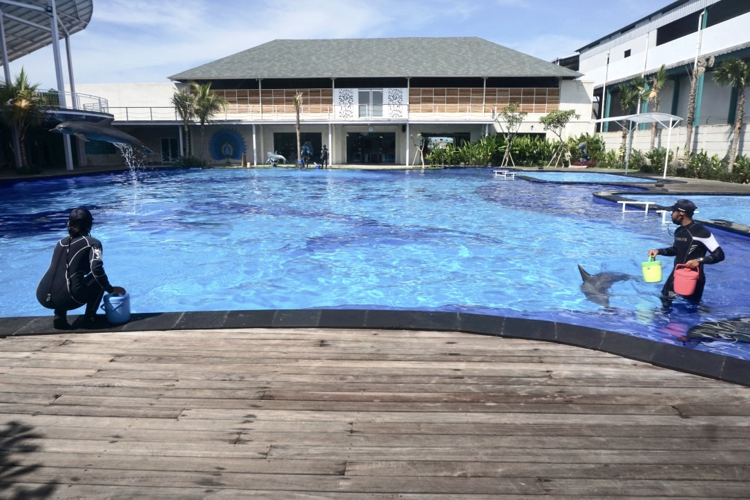 Sejauh mata memandang, ada tiga kolam, dua diantaranya berukuran kecil. Namun ketiganya terkoneksi. Nampak lima lumba-lumba sedang mendekati bibir kolam, dekat para pelatih yang bersiap menemani dan memberi makan pada pukul 10 pagi. Koordinator pelatih adalah Hariyadi, pelatih senior yang sedang mendampingi usai pelatihan jadi trainer lumba-lumba di PT. WSI.