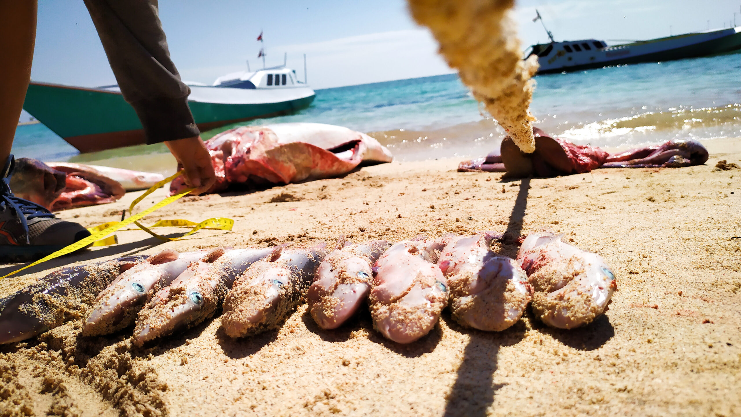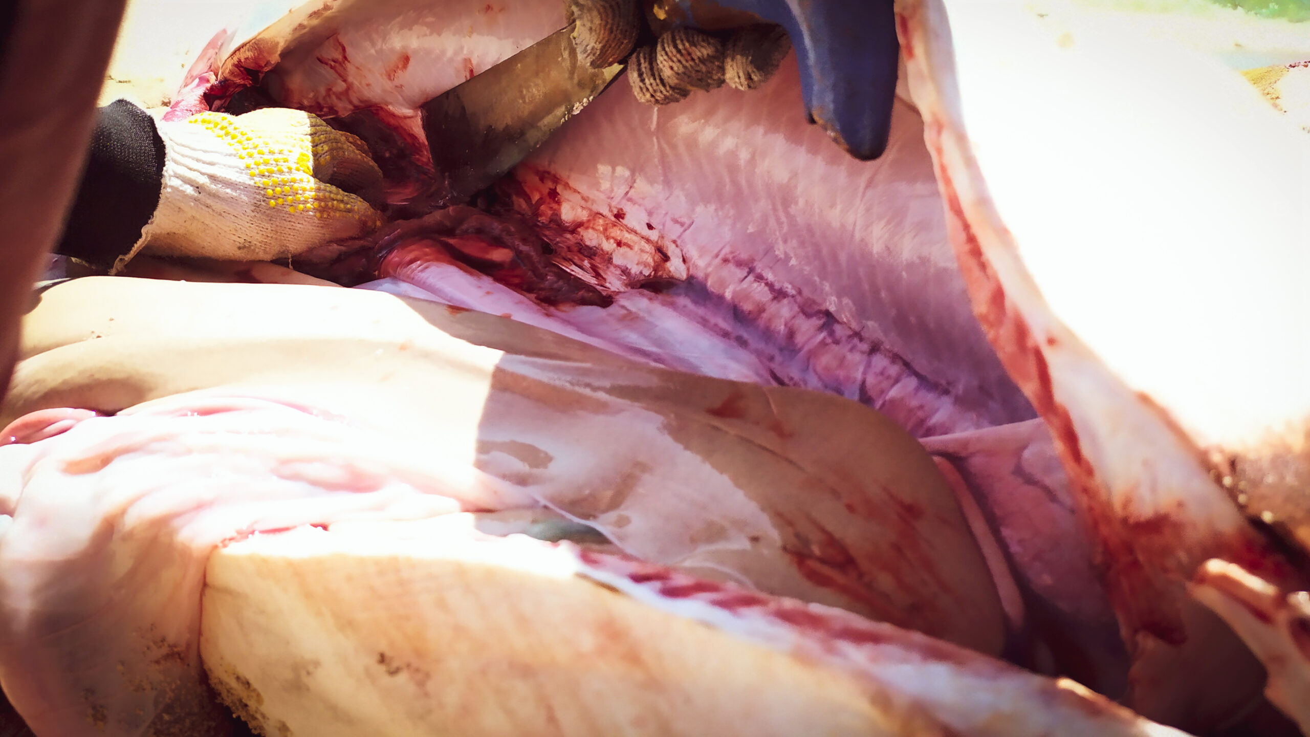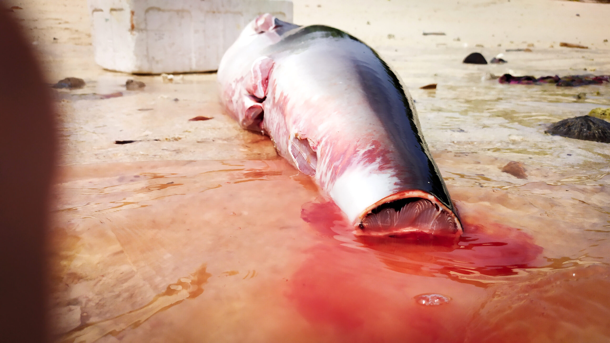 Di kawasan timur Indonesia, Pulau Ambo jadi tempat pendaratan hiu terbesar. Saban hari, ada puluhan hiu yang pangihang daratkan. Mereka memulai musim tangkap dari Juli hingga April. Saya menyaksikan itu ketika berkunjung di Pulau Ambo, pada Juli 2019. Melihat itu seperti menyaksikan proses pembantaian. Pantai berwarna merah, penuh darah hiu. Aksi jagal itu jadi tontonan warga, anak-anak tertawa memainkan tubuh hiu, menaikinya seolah menunggangi kuda.