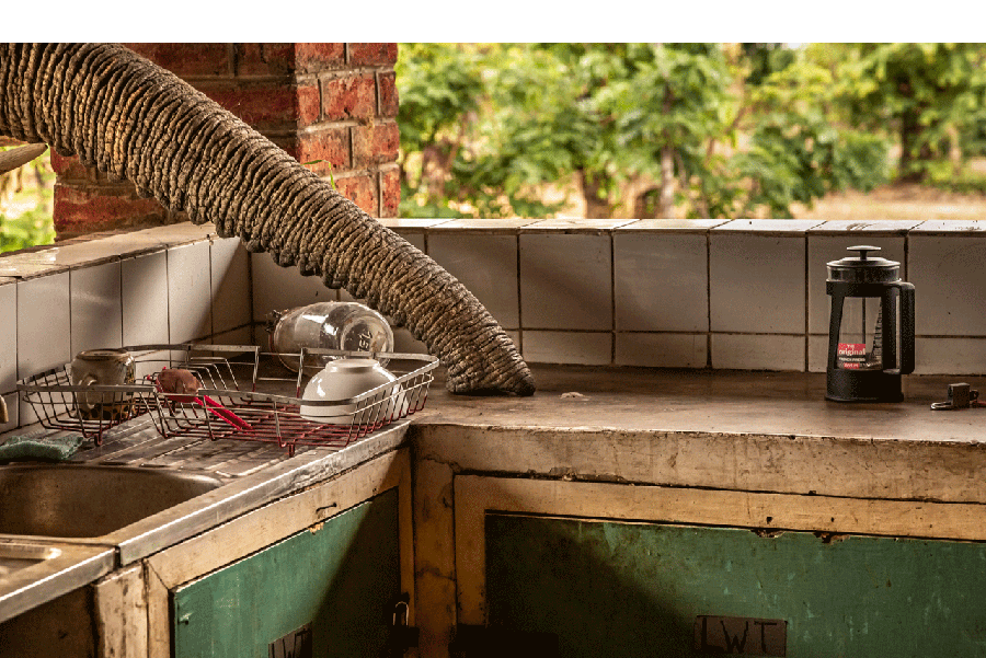 Belalai gajah menggapai ke sebuah dapur terbuka, seolah penjajaran kehidupan alami dan domestikasi yang menakjubkan.