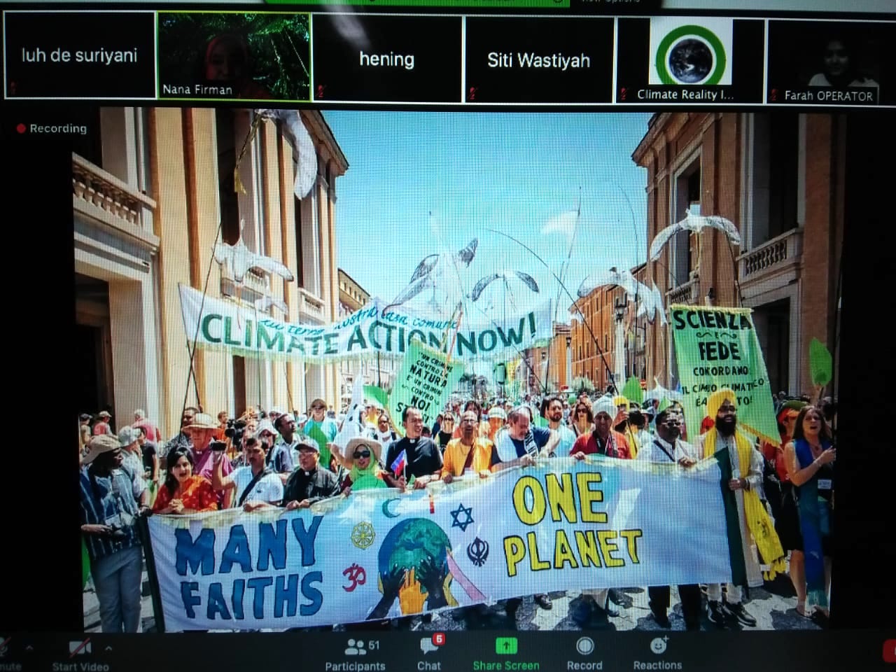 Ia menyontohkan saat Green Faith kampanye di Konferensi Perubahan Iklim COP di Jerman pada 2017 mereka mengajak mengubah gaya hidup. “Kita naik becak dan sepeda ke gedung PBB untuk kampanye komitmen mengubah gaya hidup,” ingatnya menunjukkan foto-foto.