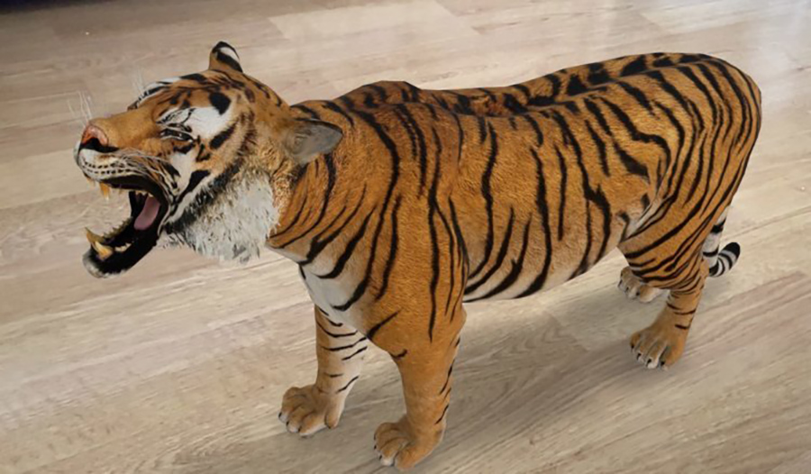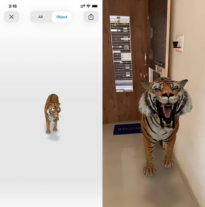 Lalu klik di View in 3D, and kita akan dibimbing oleh kamera untuk menemukan harimau virtual di rumah kita. Setelah ketemu, kita akan menemukan harimau dalam bentuk 3D yang bergerak.