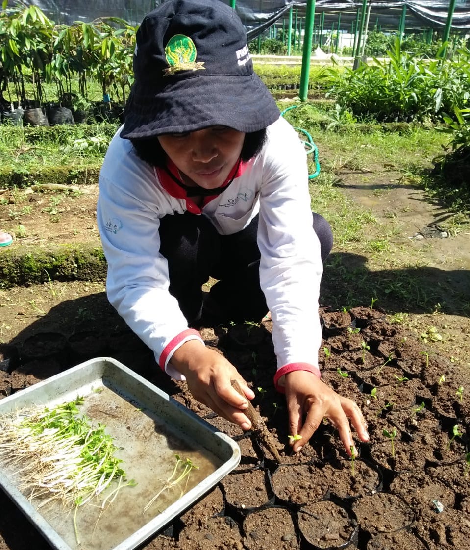 Akar benih dibersihkan dari tanahnya, kemudian satu demi satu dengan telaten ditanam di polybag yang materi tanamnya berbeda, yakni pupuk kandang dan tanah. Bagian ini memerlukan banyak tenaga karena jumlah hasil semaian ribuan. Setelah tingginya sekitar 30 cm, bibit siap ditanam di lokasi-lokasi penghijauan atau rumah barunya.