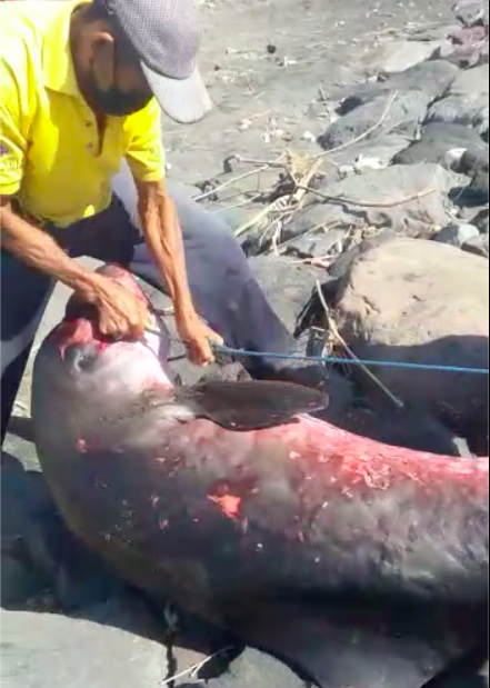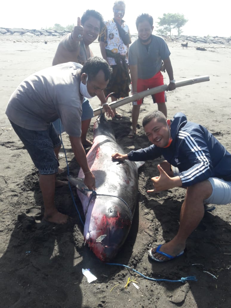 Seekor individu diduga paus sperma kerdil atau Kogia sima (dwarf sperm whale) terlihat terluka penuh darah terdampar di Pantai Lembeng, Gianyar, Bali pada Kamis (18/6/2020) sore. Paus kerdil malang itu kemudian ditarik sejumlah orang dengan bantuan sebatang bambu dan tali yang diikatkan di ekornya. Selanjutnya, satwa laut ini jadi potongan daging.