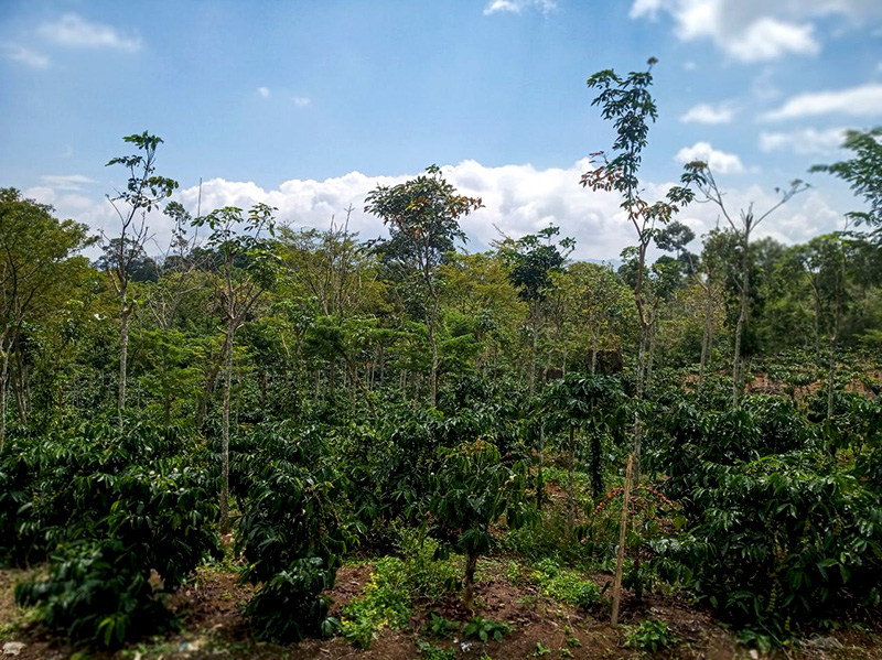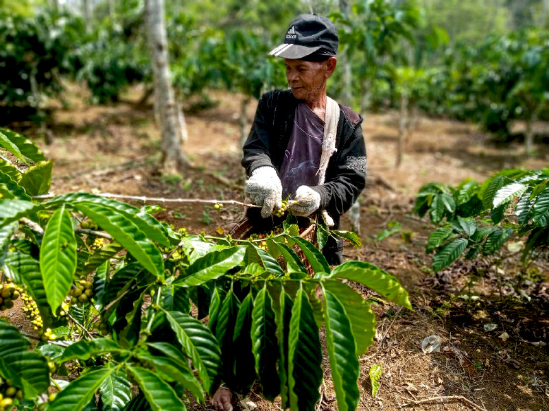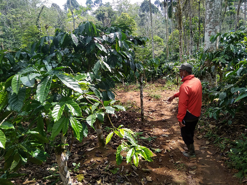 Pada ketinggian 991 meter dari permukaan laut [m dpl], Erfan menanam kopi yang diselingi tanaman sengon, lamtoro, alpukat, durian, pisang, lada, cabai rawit, dan empon-empon.