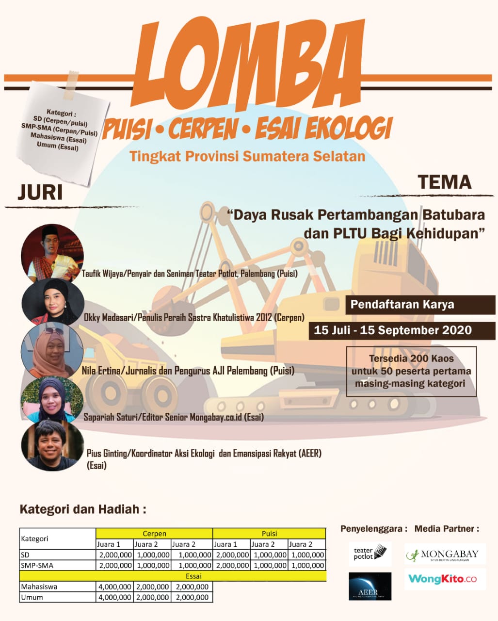 - Melihat keterancaman warga dan lingkungan Sumatera Selatan atas pembangunan PLTU mulut tambang, Perkumpulan Aksi Ekologi dan Emansipasi Rakyat (AEER) bekerjasama dengan Teater Potlot, Palembang menggelar Lomba Puisi, Cerpen dan Esai, bertajuk “Daya Rusak Pertambangan Batubara dan PLTU bagi Kehidupan.” Pendaftaran dibuka sejak 15 Juli dan ditutup 15 September 2020 dengan mengisi formulir melalui link berikut : https://forms.gle/yGxvpwFFCdMM8jEC9.