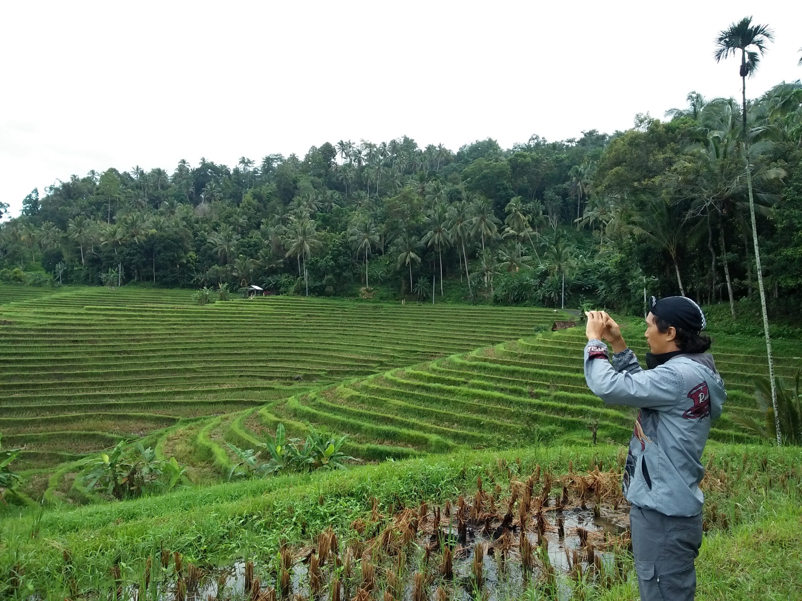 Kami harus berpisah dengan kakek ramah ini melanjutkan perjalanan berikut. Wisli memandu dengan tangkas melewati jalan utama persawahan yang baru dibeton. Terasering terlihat sambung menyambung, tak terputus mirip sarang laba-laba. Di beberapa sudut, sejumlah petani membuat lahan sayur dan bumbu untuk keperluan sendiri di sepotong lahan sawahnya.