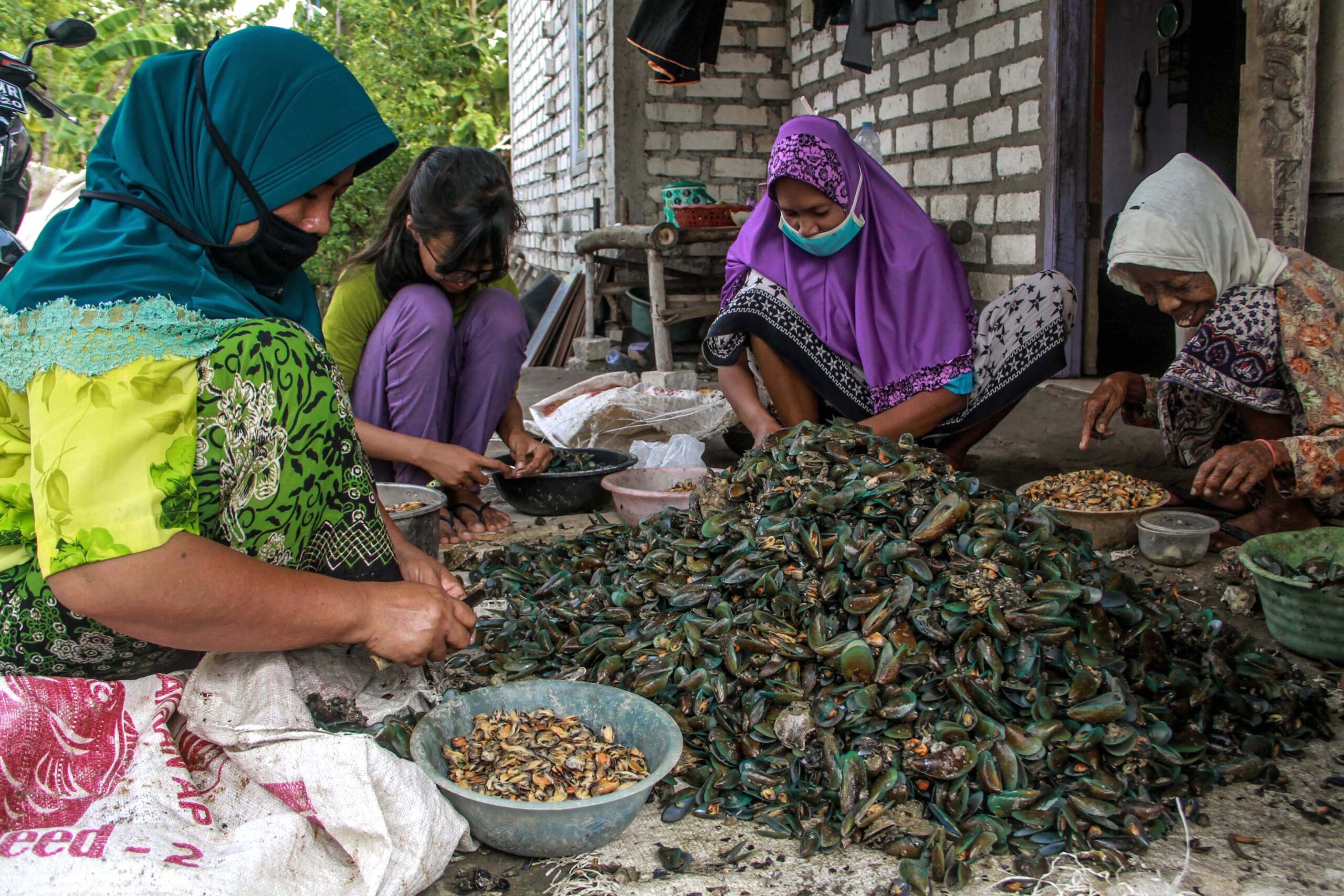 Tangan Nur Biatin tampak cekatan mengelupas satu per satu daging kerang hijau dari cangkang ke sebuah ember berbahan plastik. Matanya cermat menatap kerang yang mempunyai nama latin Perna viridis itu. Sesekali ia mengusap wajahnya di saat keringat bercucuran.