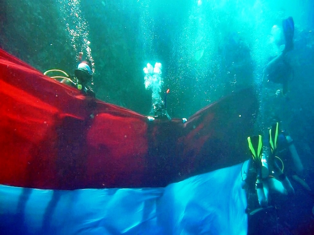 - Pengibaran Bendera Merah Putih dilakukan pada kedalaman 24 meter persis d lokasi patahan dan gua dimana saat pengibaran bendera terdapat seekor hiu karang dan penyu yang berada tak jauh dari penyelam