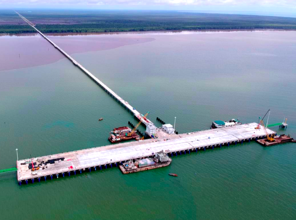 Pelabuhan dibangun di lepas pantai, sementara jalan sepanjang 57 kilometer dan lebar 30 meter, sebagian besar menggunakan jalan produksi perusahaan HTI, yaitu PT Bumi Andalas Permai [BAP] sepanjang 45 kilometer.