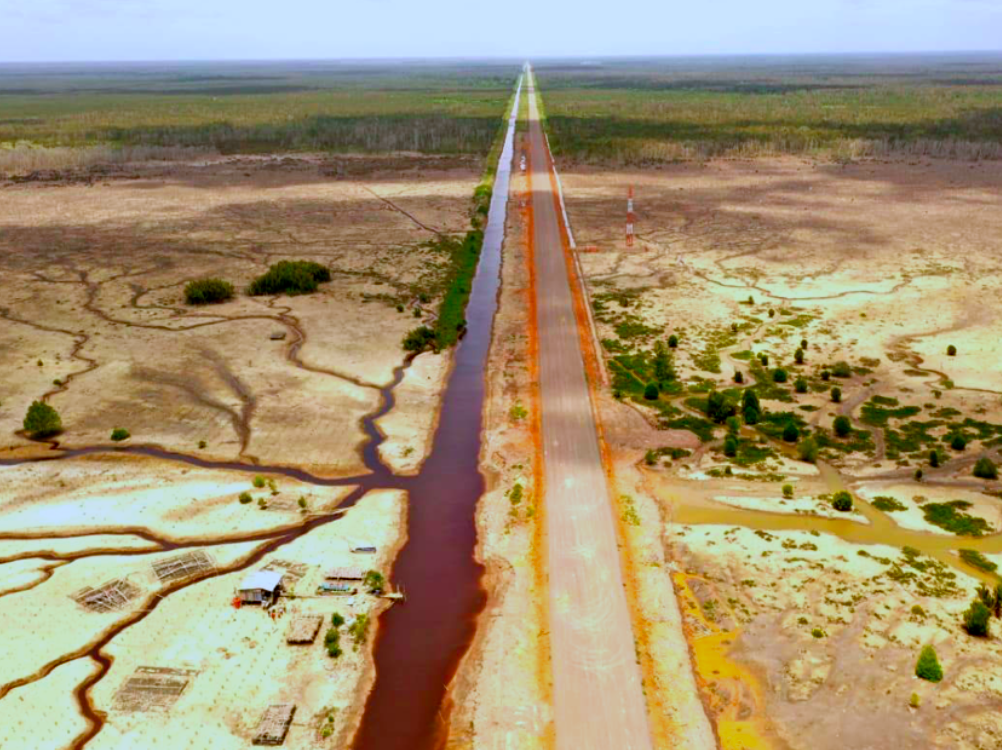 Sementara jalan sepanjang 12 kilometer dibangun bertiang di atas kanal eks perusahaan HPH, termasuk melewati kawasan hutan mangrove.