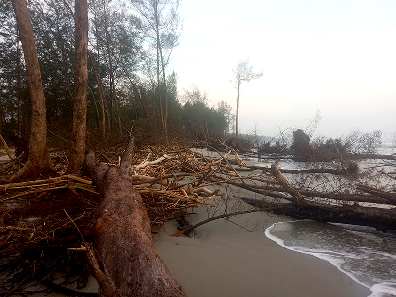 Di ujung pantai Pasir Putih yang lokasinya dekat kantor Kesatuan Pengelolaan Hutan Konservasi [KPHK] Taman Wisata Alam [TWA] Pantai Panjang – Pulau Baai dan Resort Kota BKSDA Bengkulu, tak terlihat lagi sejumlah pepohonan. Bakau, akasia, jeruju, pandan laut, nyamplung, biduri, cemara laut, tapak dara, ketapang, seruni laut, hingga dandelion hilang. Berganti menjadi hamparan pasir yang diteduhi batang-batang cemara besar saja.